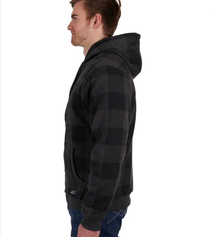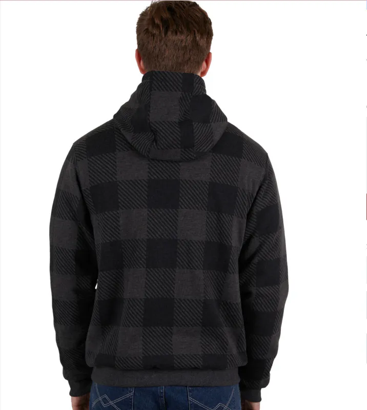 Heavyweight brushed fleece hooded jacket, sherpa-lined body and hood for comfort and warmth, all over tonal printed check design, chest logo embroidery, hood with drawcord closure and metal trims, kanga patch pockets, rib trim hem and cuffs.