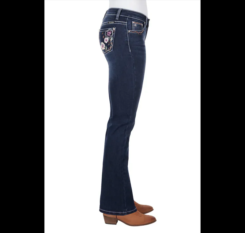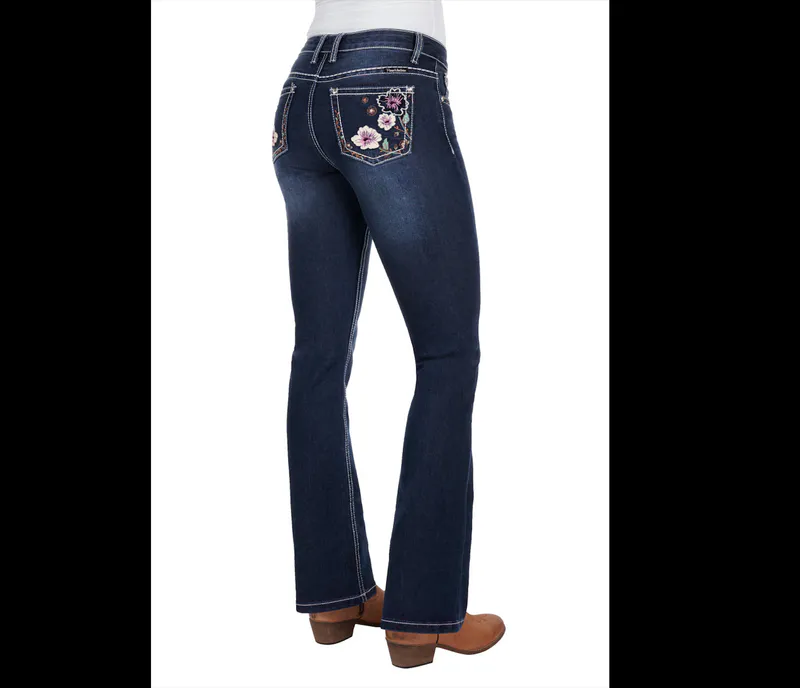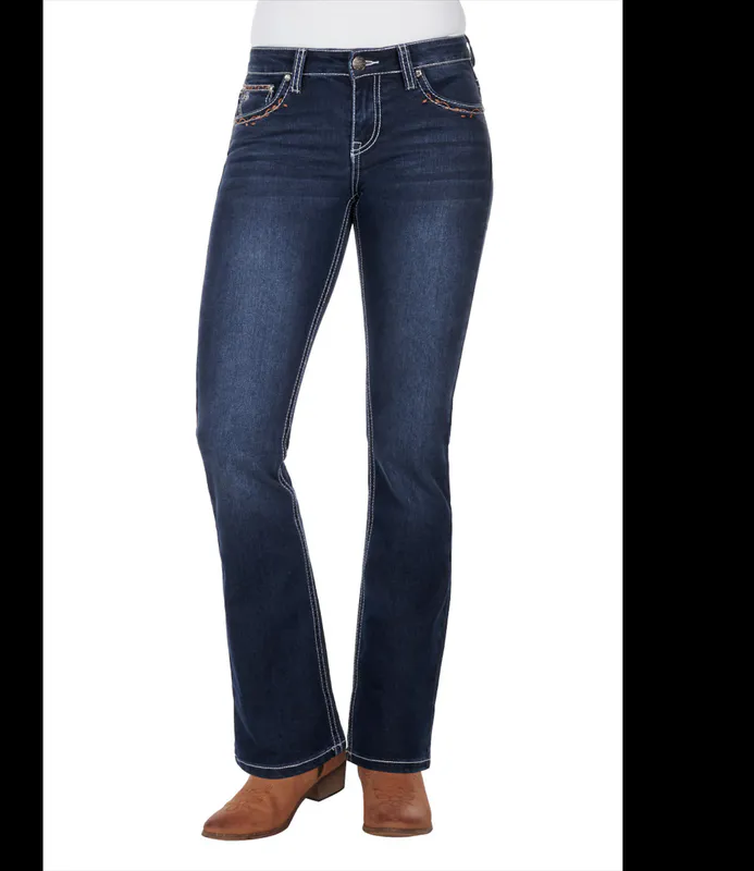 32 Inch leg - boot cut, stretch for comfort, mid rise, logo shank button, diamante rivets, woven logo badge on back yoke, PW embroidery on coin pocket, feature embroidery on back pockets and front scoop pockets, contrast all over topstitch.