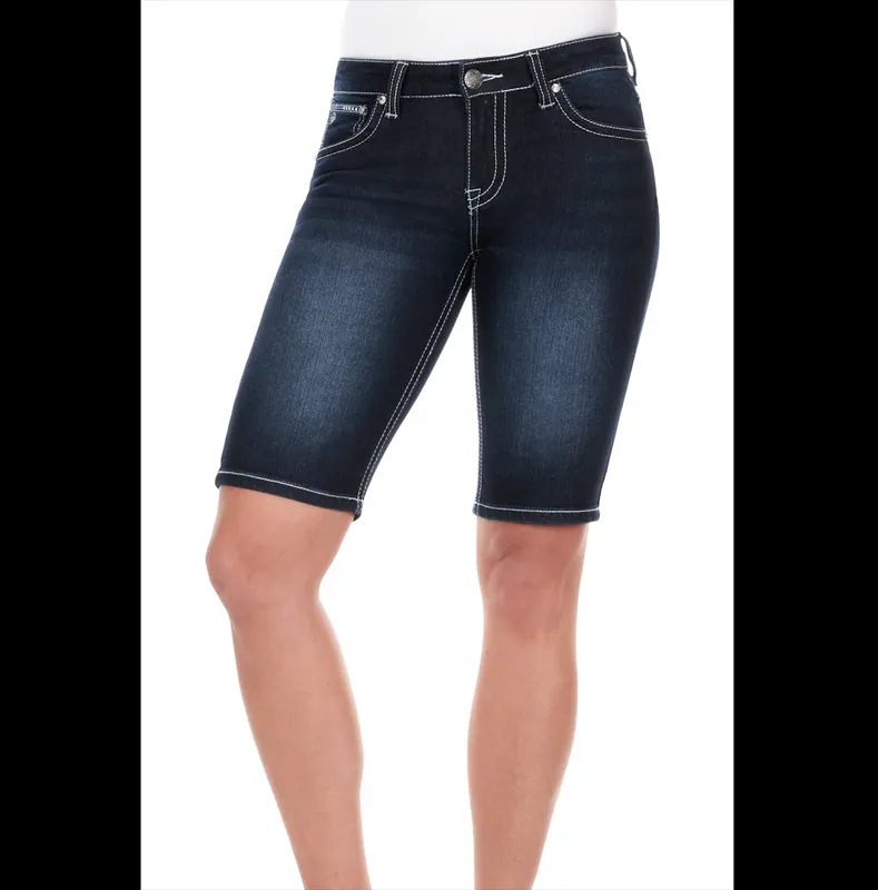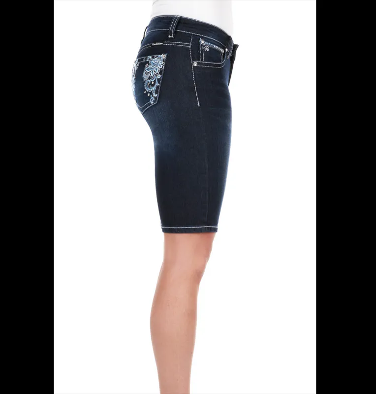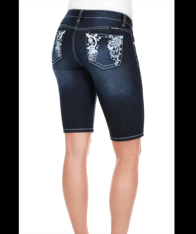 Stretch for comfort, mid rise, sits above knee, logo shank button, diamante rivets, woven logo label at back yoke, PW embroidery on coin pocket, turn up cuff, feature embroidery on back pocket and front coin pocket, contrast all over topstitch.