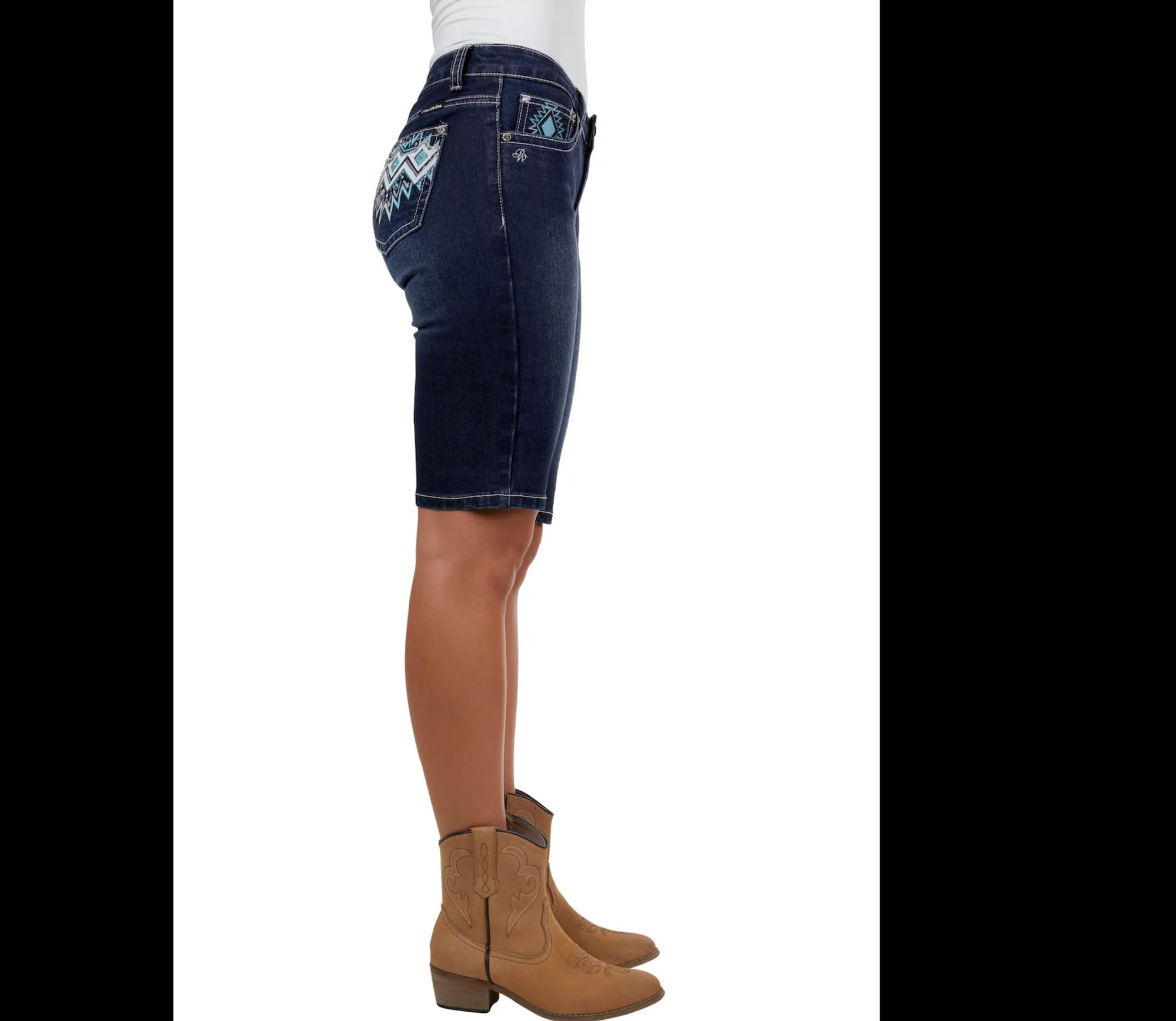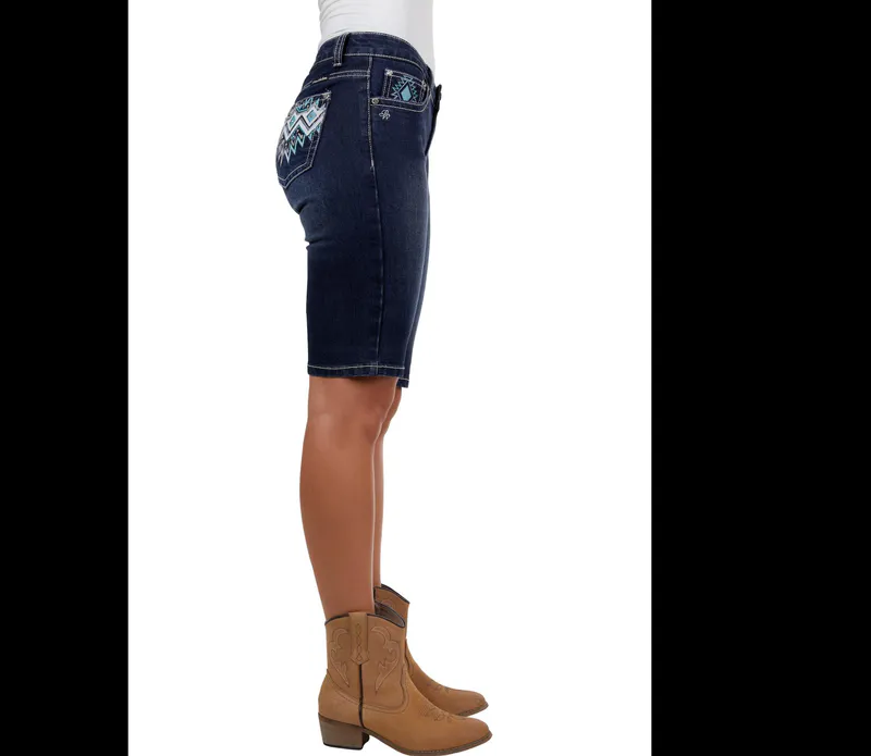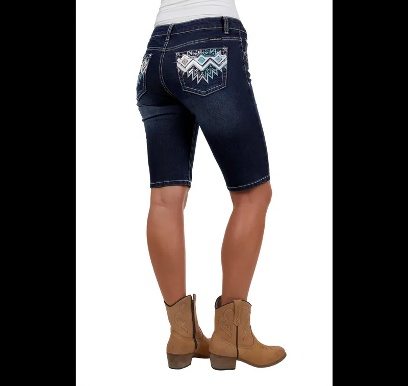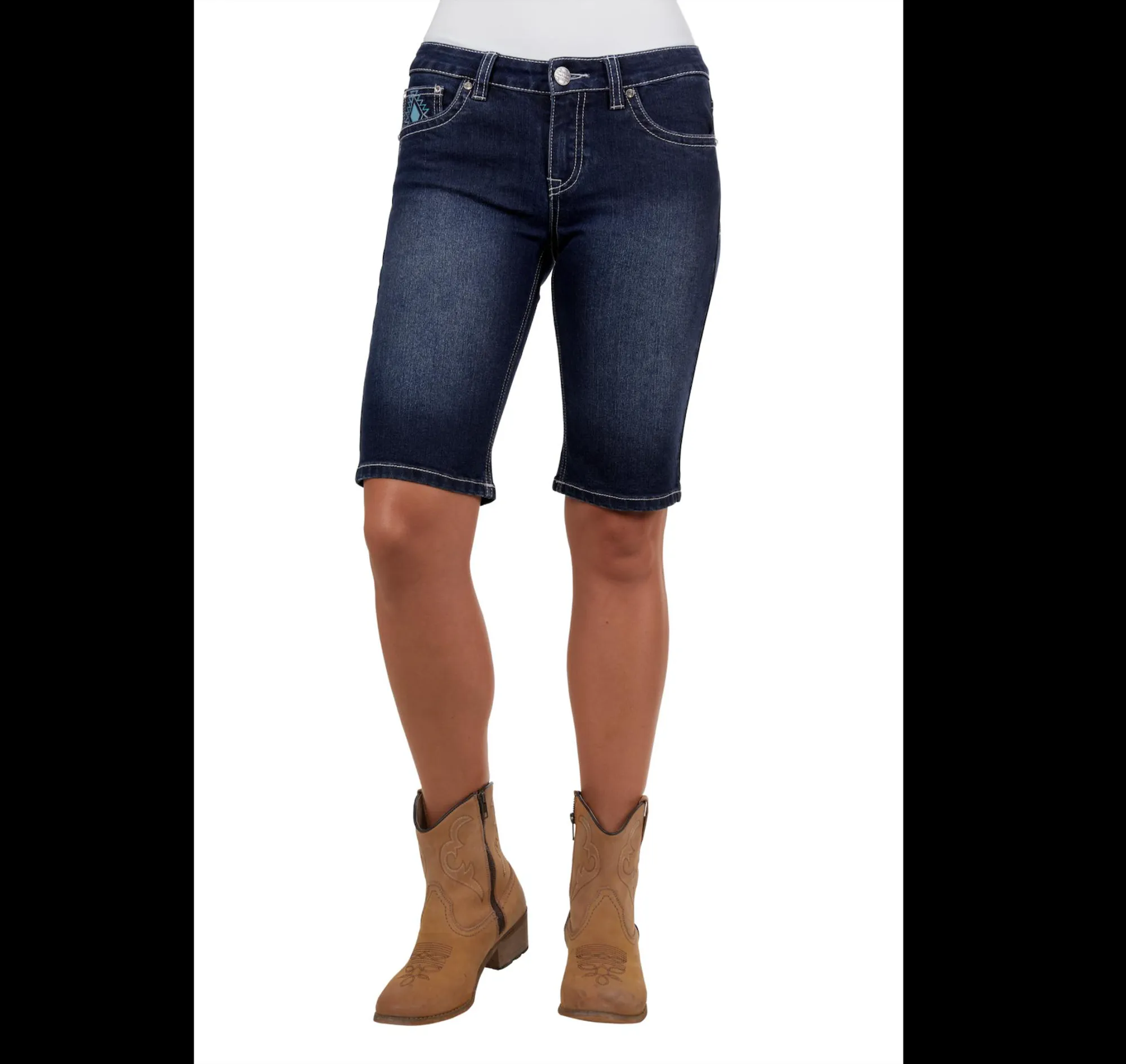 Stretch for comfort and movement, Mid rise, Sits above knee, Logo shank button, Diamanté rivets, Woven logo label on back yoke, Feature embroidery on back pockets and coin pocket, PW embroidery on front pocket, Contrast all over topstitch.