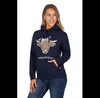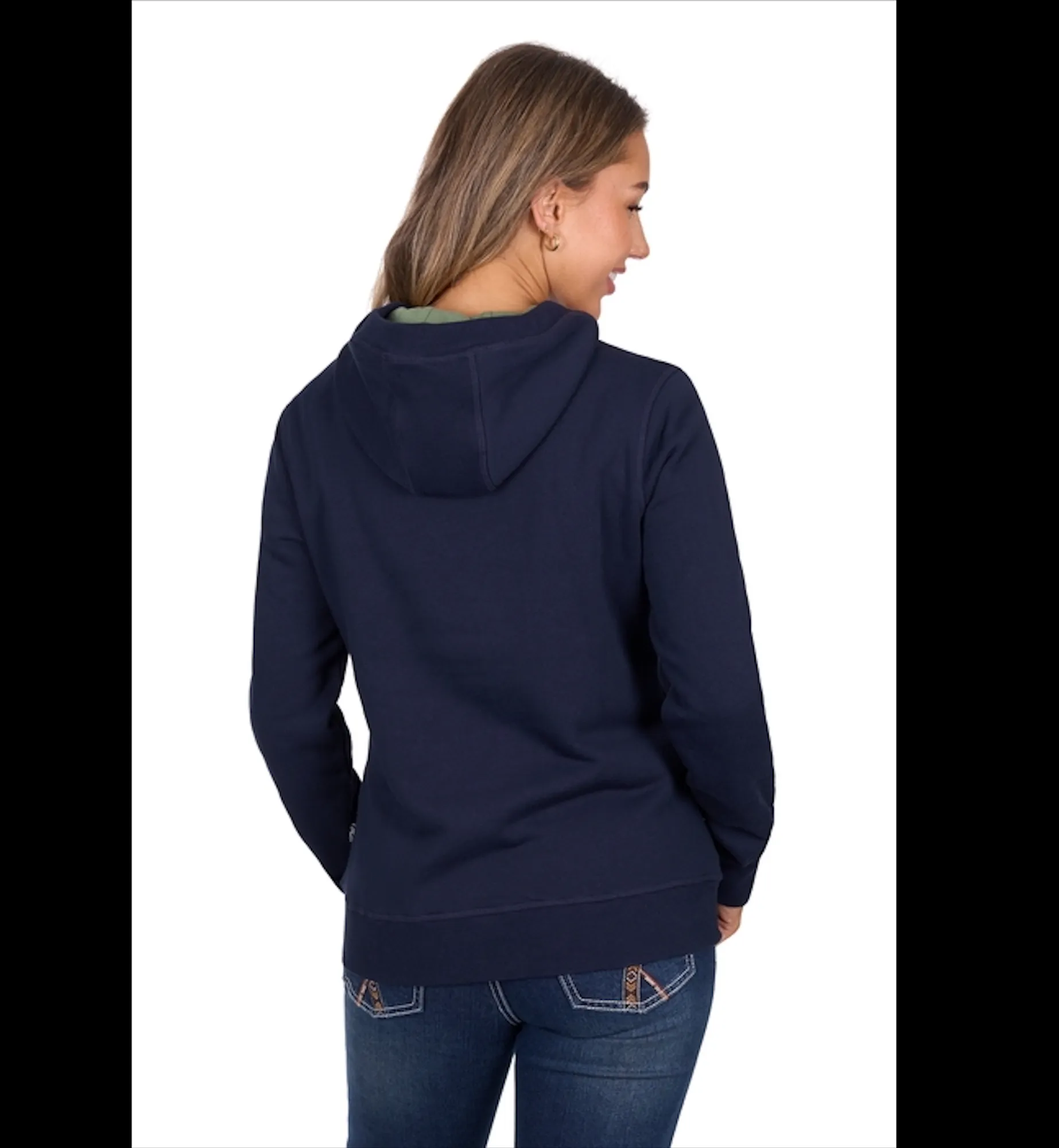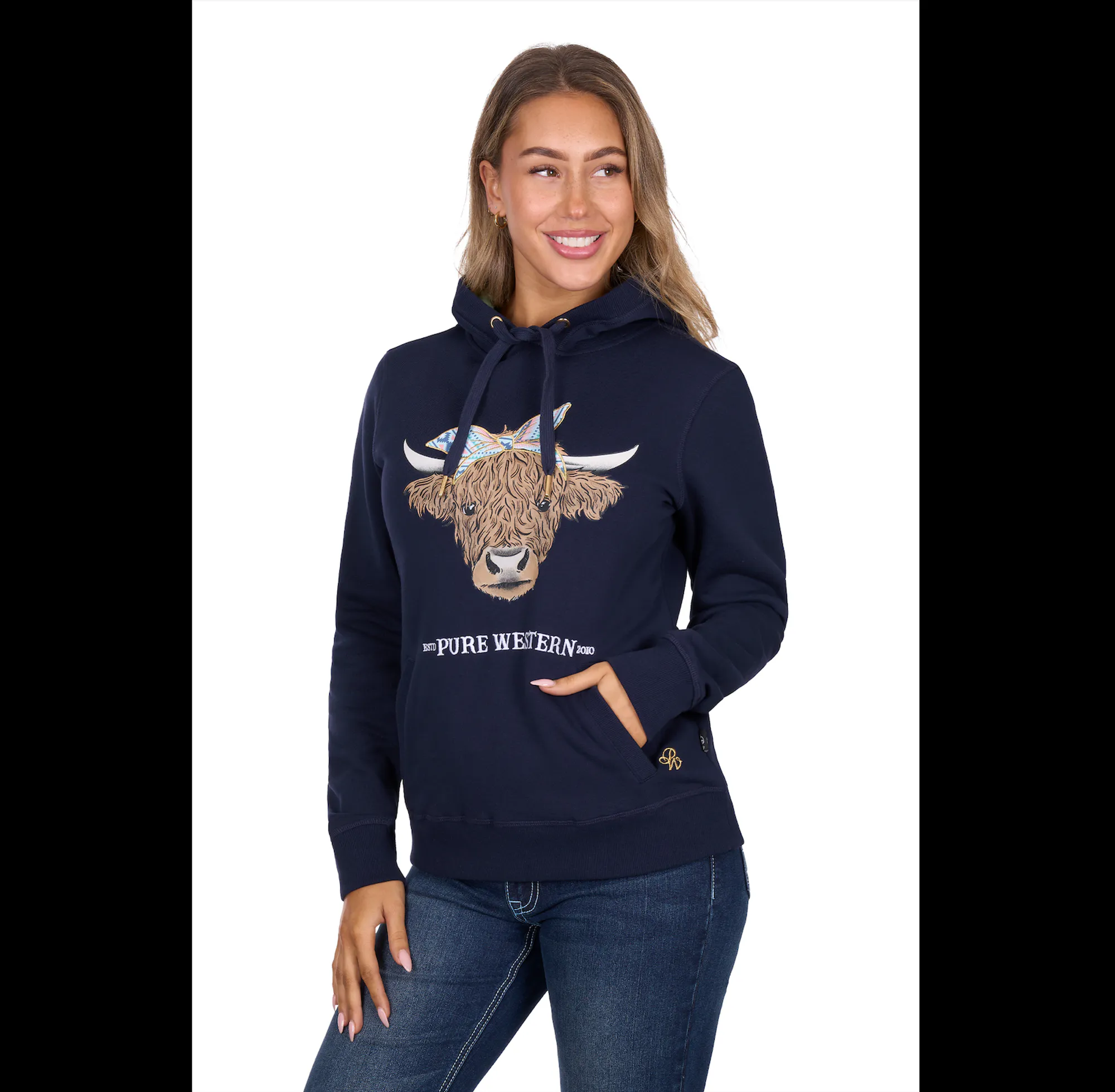 Heavyweight brushed fleece pullover hoodie, hood with contrast jersey lining, hood with drawcord closure and metallic trims, front welt pockets, rib trim hem, cuffs and front hood edge, Pure Western logo pip on side seam.