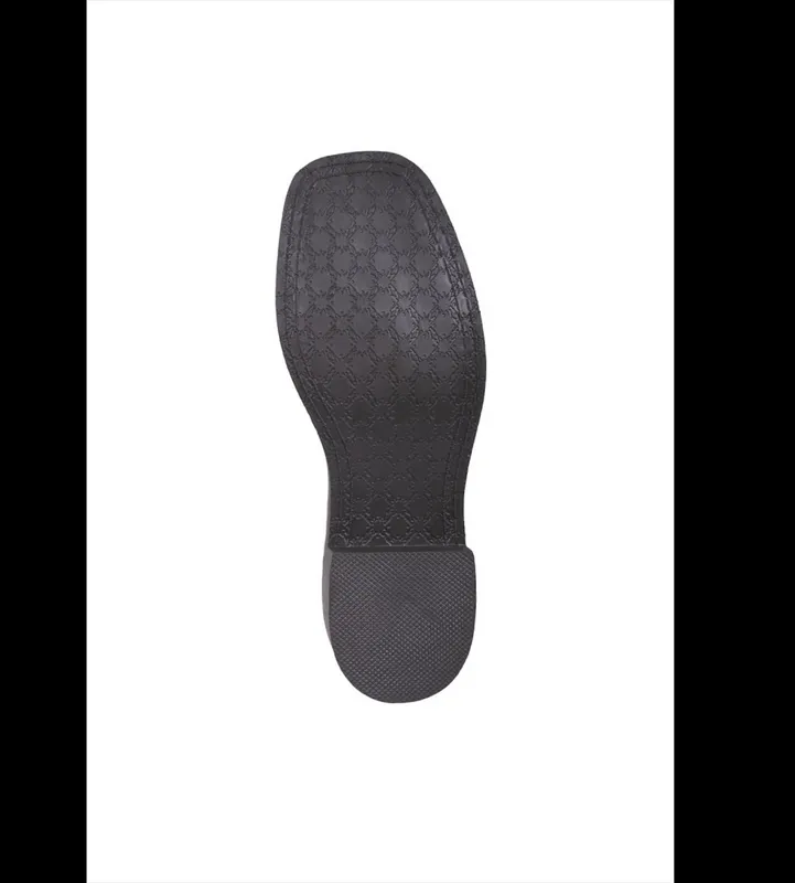 Grained leather upper with shaft and toe stitch detail, synthetic lining, padded innersole for comfort, stitched durable square toe rubber outsole.