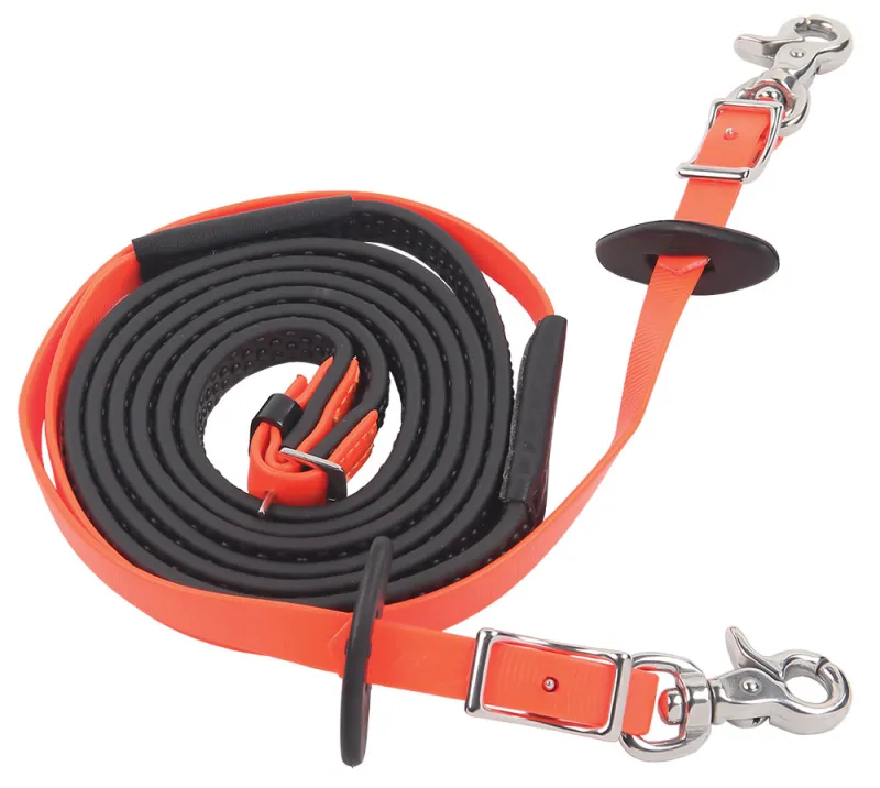 These reins are made from 19mm webbing and feature lighweight, yet strong stainless steel rein snaps for quick and easy fitting/removal. The grips are made from soft, pliable rubber grip that is extremely comfortable in the hands and that offer excellent wet weather grip.