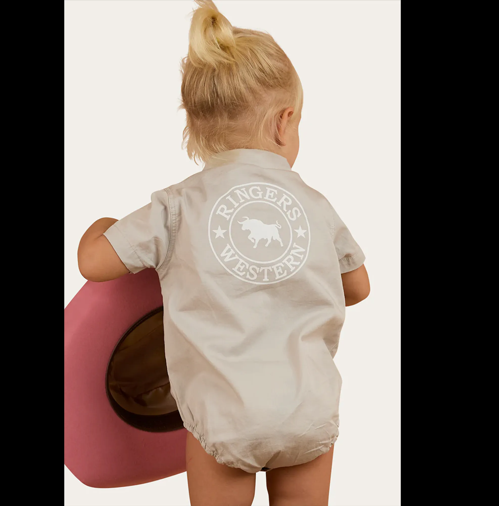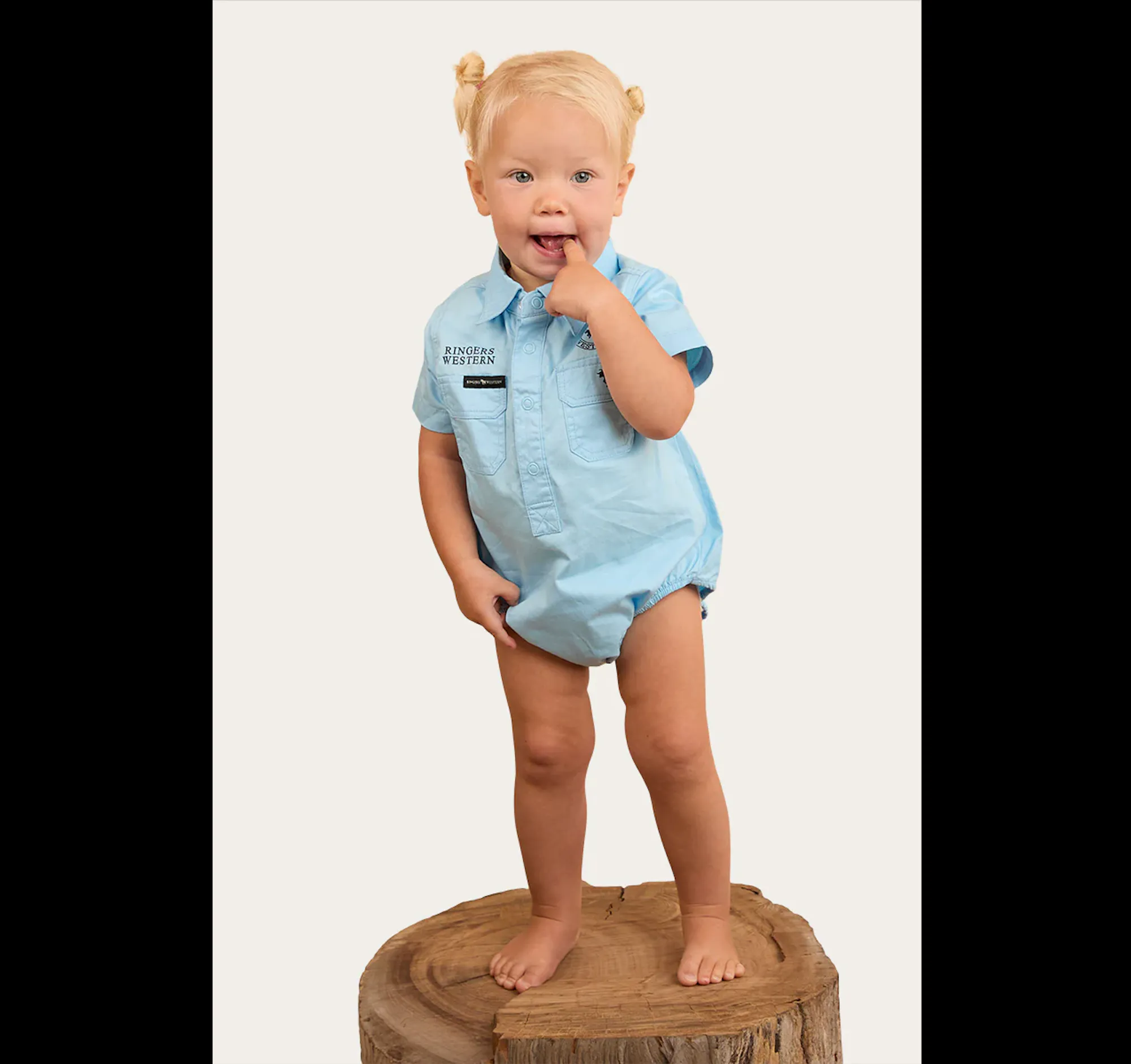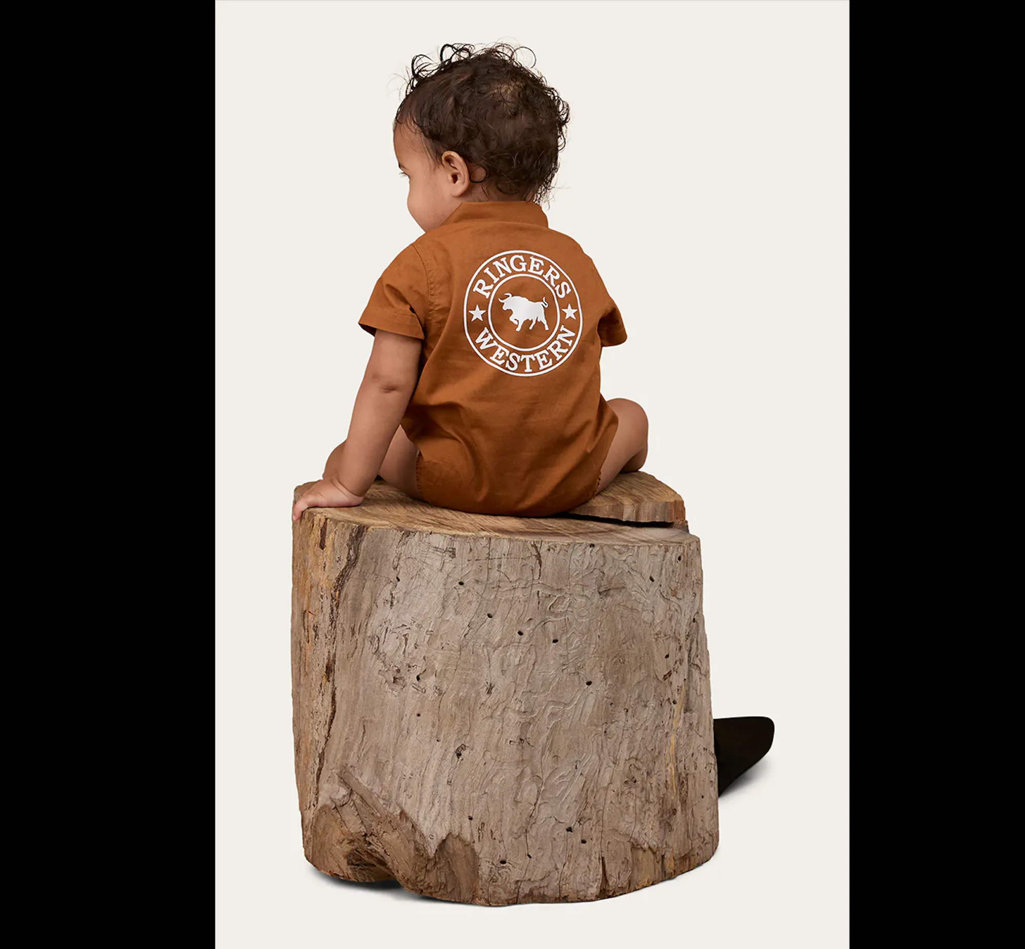 The Ringers Babies Short Sleeve Work Shirt Romper is created from 100% premium cotton, this fabric has a super soft handfeel and offers fantastic comfort and breathability - which is so important for the little ones in our warm, humid climate. A tribute to our classic work shirt design, this romper features mock dual chest pockets as well as our Signature logo on the back. A handy snap button closure makes changes a breeze, making this little romper a convenient and stylish choice for bub at your next rodeo!