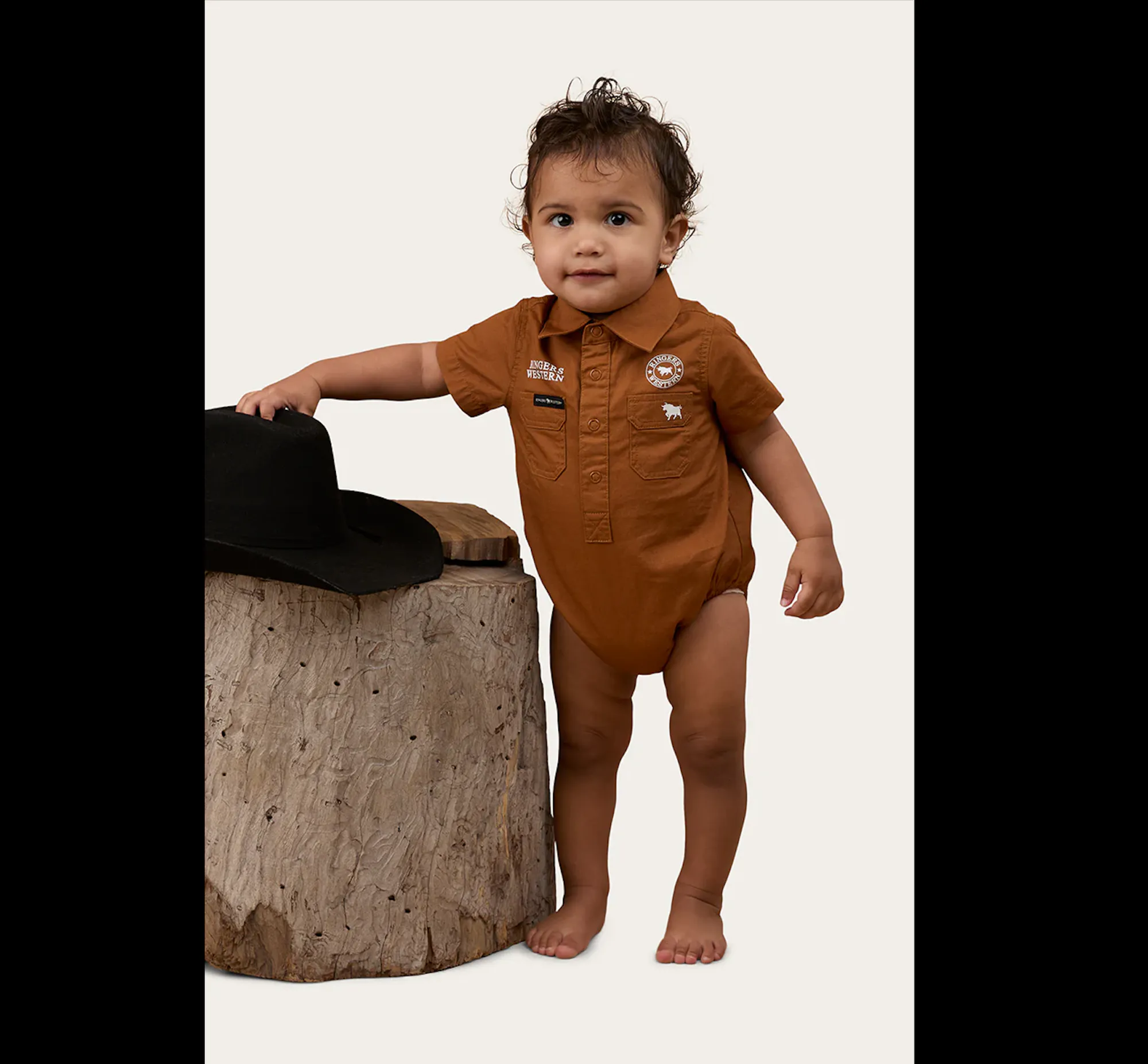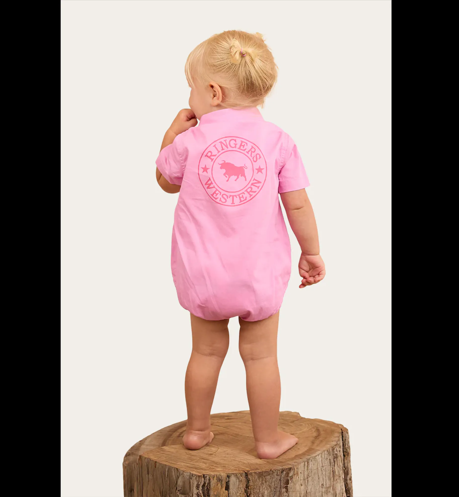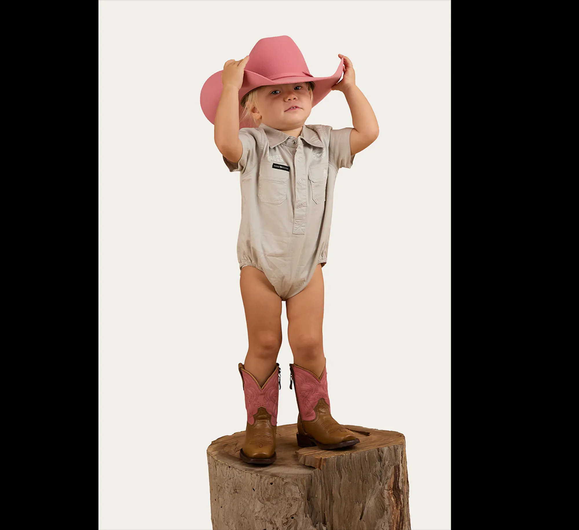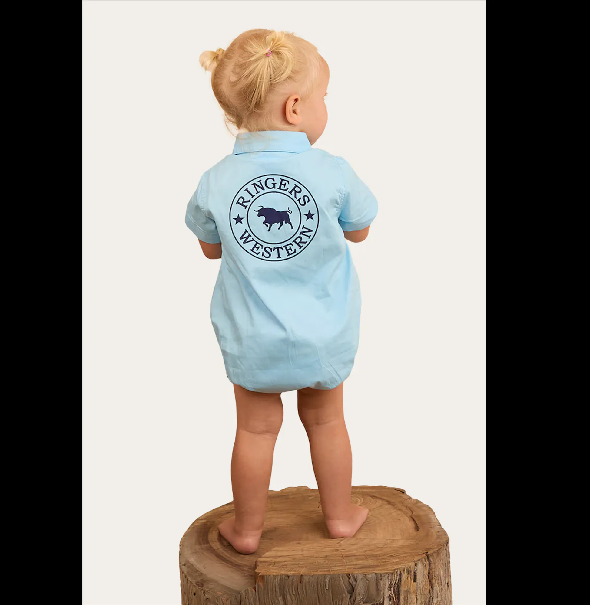 The Ringers Babies Short Sleeve Work Shirt Romper is created from 100% premium cotton, this fabric has a super soft handfeel and offers fantastic comfort and breathability - which is so important for the little ones in our warm, humid climate. A tribute to our classic work shirt design, this romper features mock dual chest pockets as well as our Signature logo on the back. A handy snap button closure makes changes a breeze, making this little romper a convenient and stylish choice for bub at your next rodeo!
