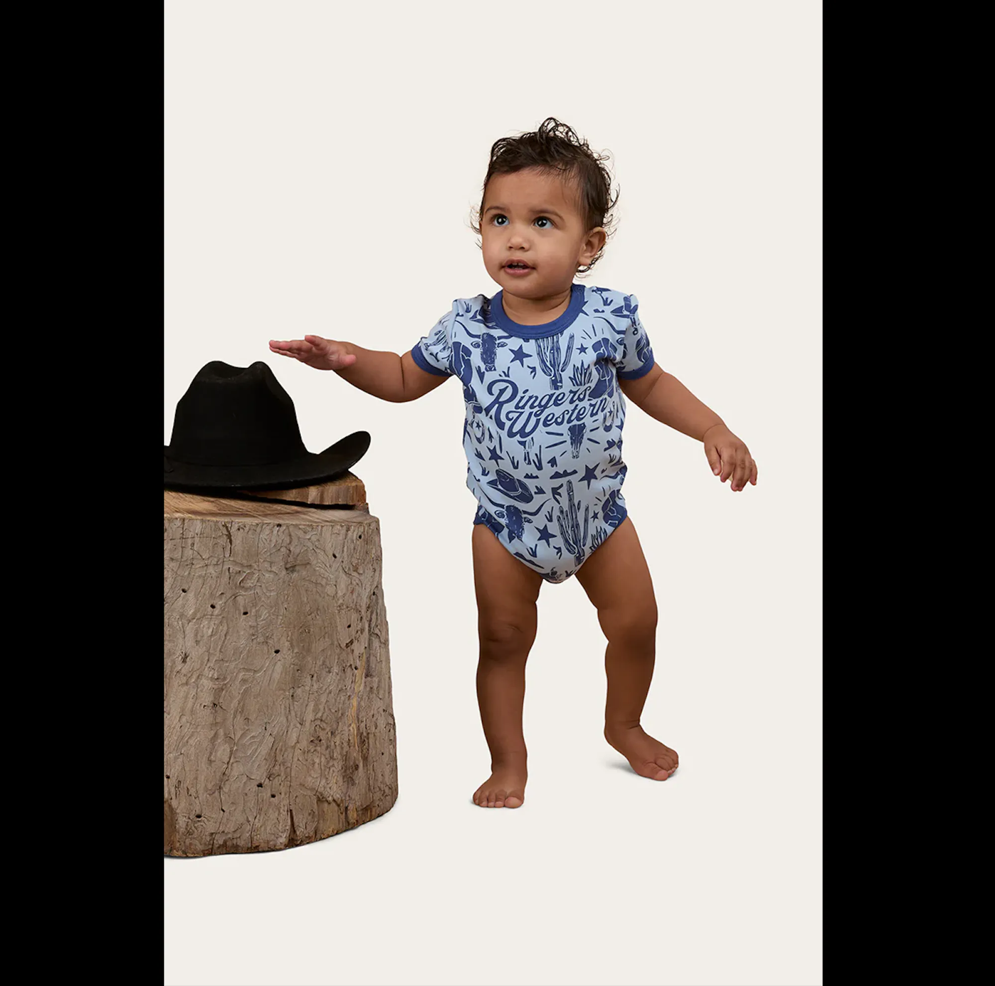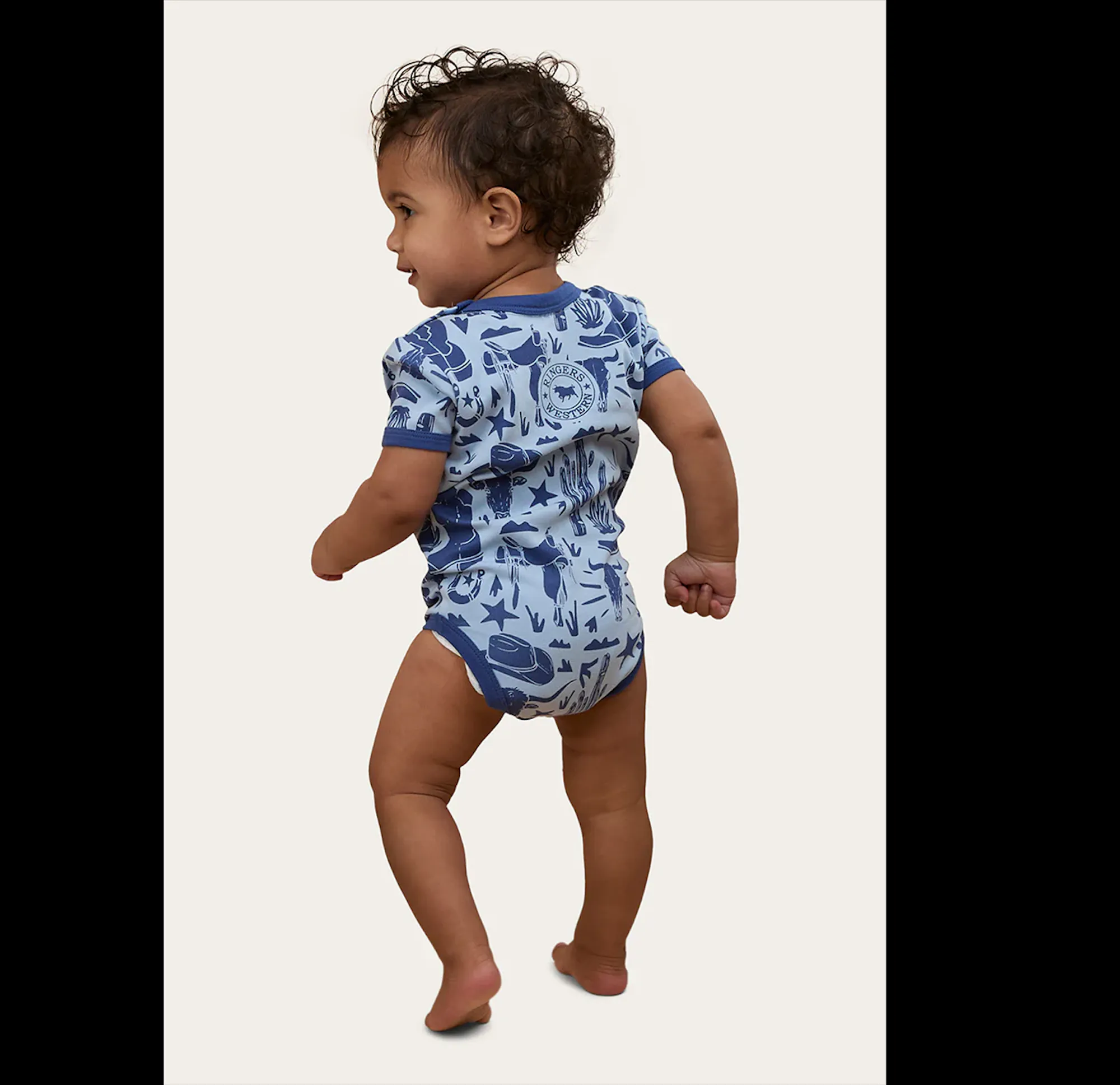 The Boot Scootin Babies Short Sleeve Romper has been thoughtfully created from 100% premium cotton, a fabric praised for it's superior breathability and softness - perfect against babies delicate skin. This delightful romper features snap button closures at the shoulder and crotch, making unexpected outfit and nappy changes a breeze. The relaxed fitting style features a signature Ringers Western allover yardage print, a fun and lively celebration of the wild west that is perfectly complemented by contrast binding. Get bub rodeo ready with the Boot Scootin Babies Short Sleeve Romper, a sweet and comfortable addition to every mini cowboy and cowgirls collection.
