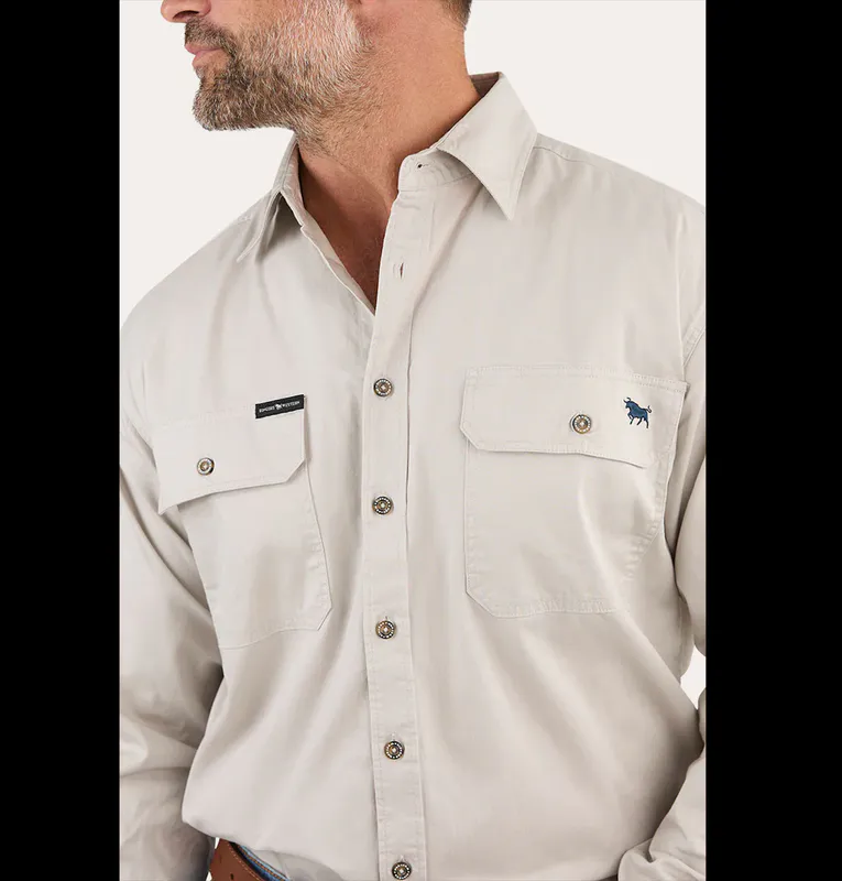 Ringers Western’s King River Mens Full Button Work Shirt is made with quality and comfort in mind. Constructed from premium cotton, this loose-fitting men’s work shirt is lightweight and breathable, making it ideal for outdoor work. With a UPF 50+ rating for sun protection, it’s built for performance in tough environments. The full-button closure and double breast pockets provide functionality, while the classic collar and small bull embroidery give it a touch of Ringers Western’s signature style.
