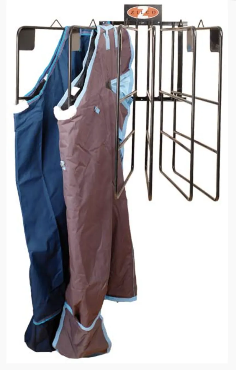 This heavy-duty metal rug rack is easily mounted on the tack room wall and comes complete with 6 adjustable & removable arms. Also popular for in-store displays.
