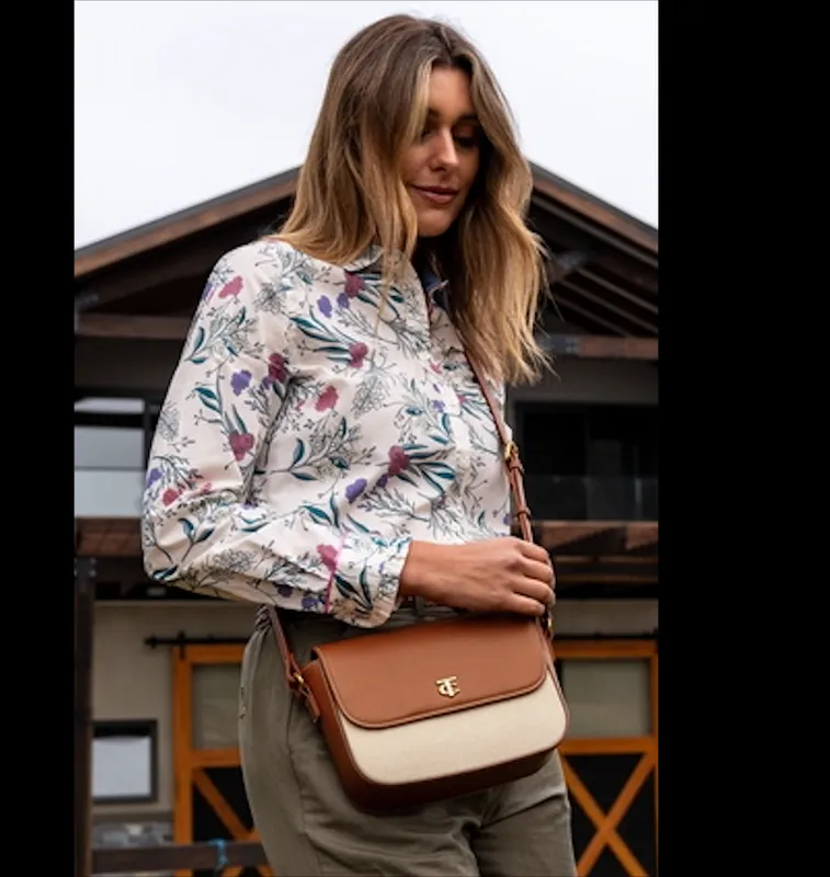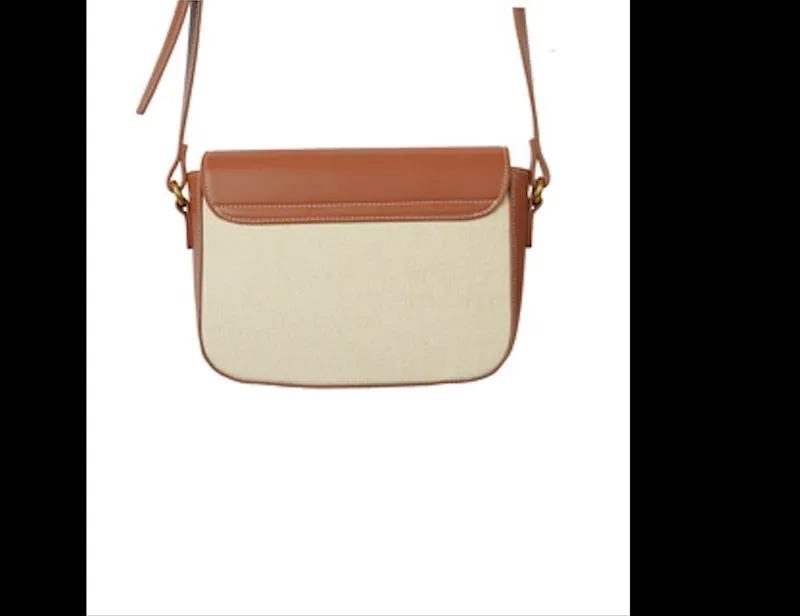 Contrast canvas and leather, magnetic closure, adjustable strap, internal zip pocket, logo metal badge, fully lined.
