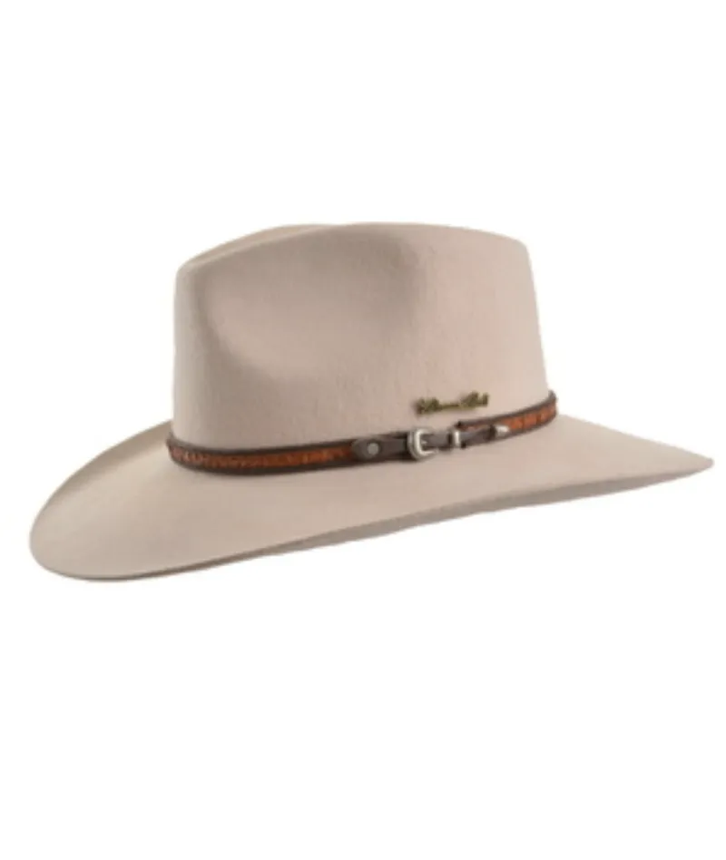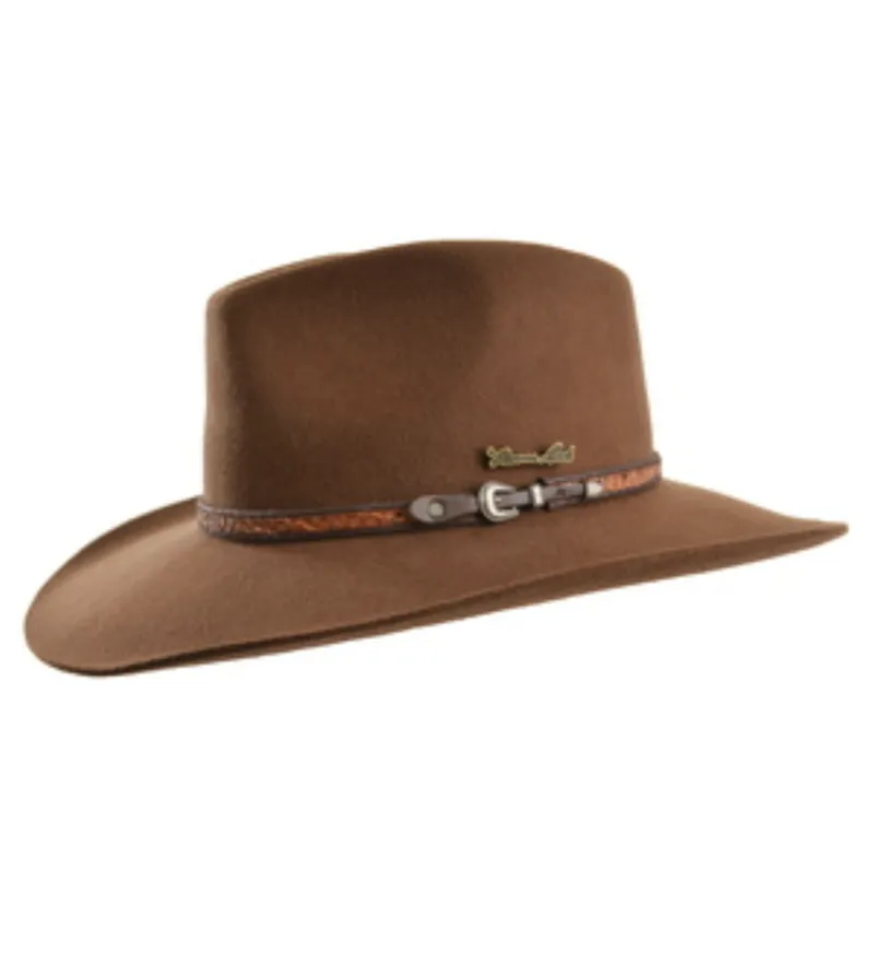 Features: Hat band with antique silver buckle and detachable feather, Thomas Cook metal logo pin, fully lined crown, leather sweatband, shower proof