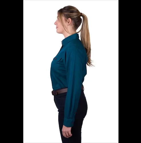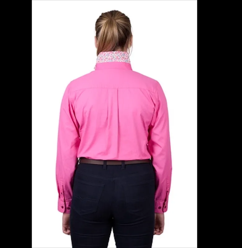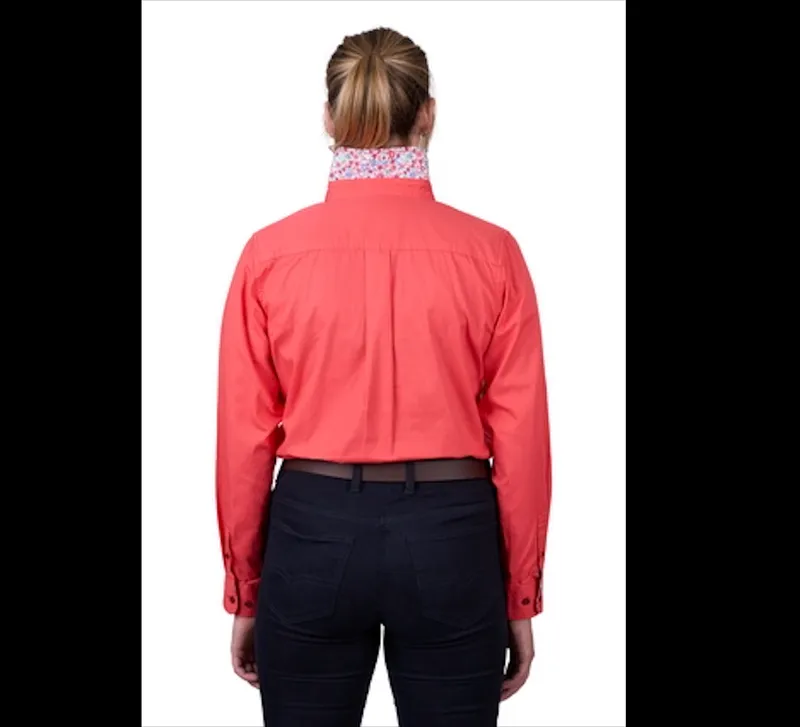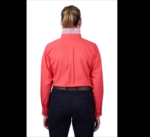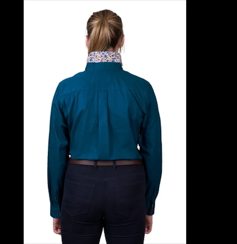 Feature floral print inner collar and cuffs with grosgrain trim, durable light weight fabric, classic work style, half placket for safety, 2 countryman pockets, logo buttons.