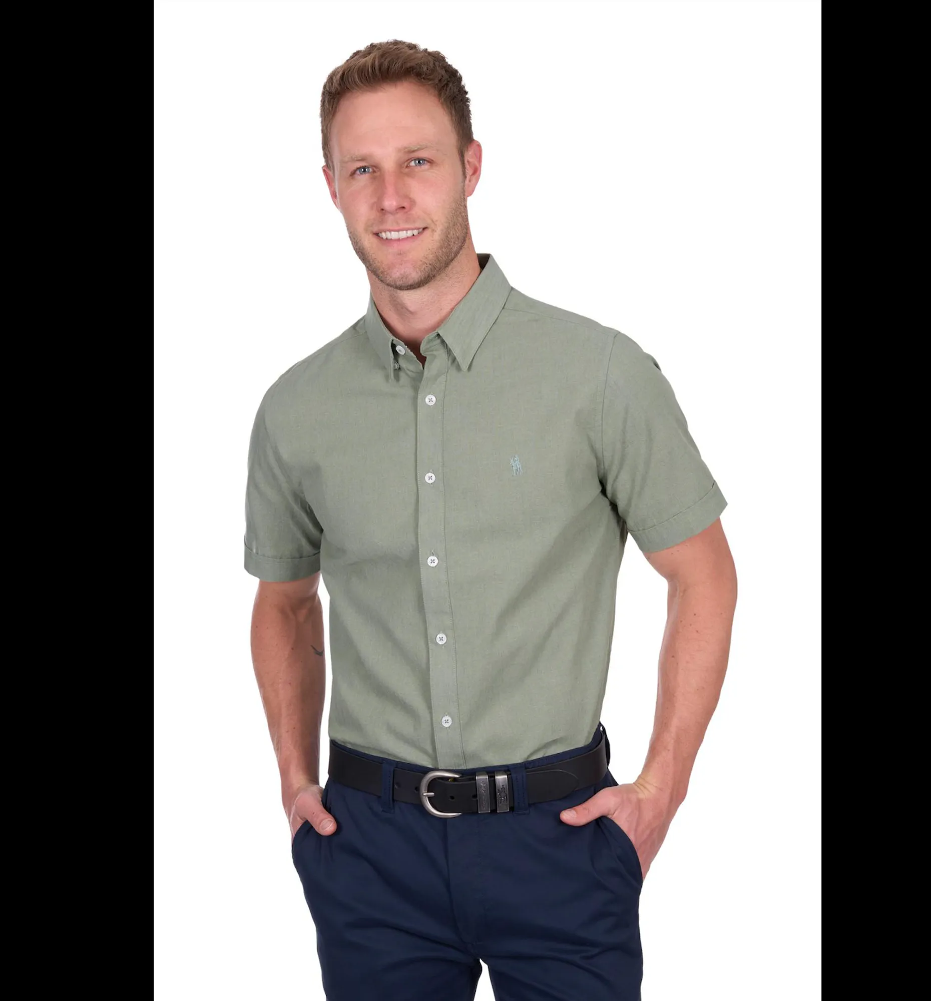 Cotton/linen blend, breathable linen blend fabric to keep you cool, contrast chambray trims, internal neck stripe taping, concealed collar peak buttons, horseman embroidery on chest.