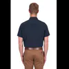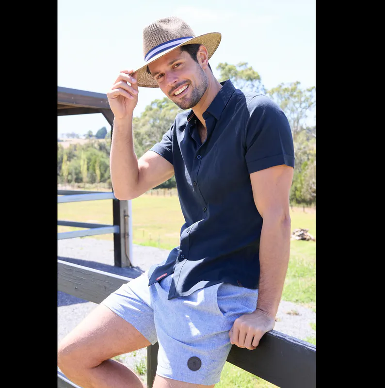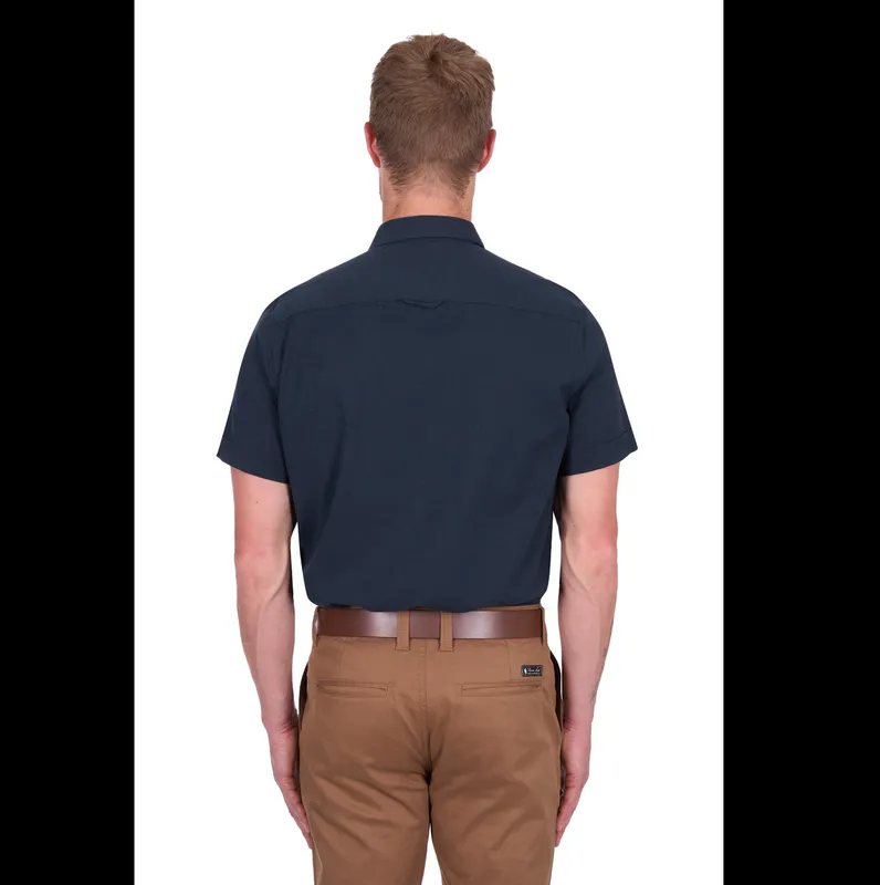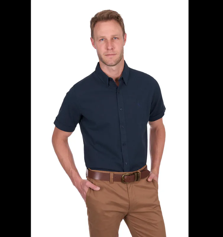 Linen blend short sleeve shirt with stretch for comfort and movement, breathable linen blend fabric to keep you cool, internal neck stripe taping, concealed collar peak buttons, removable collar stays, horseman embroidery on chest.