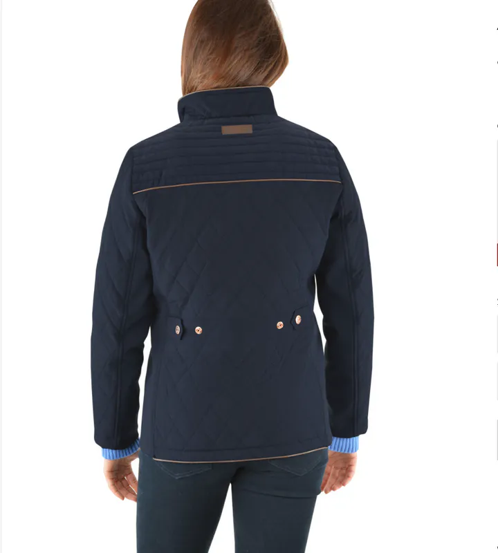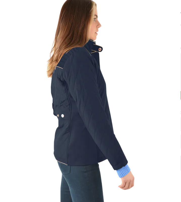 Water resistant fabric, diamond quilted, mock leather piped trim, rib inner collar and side panels for stretch and comfort, jersey lining, TC internal trims and pockets, premium zipper opening, welt pockets, horseman embroidery on chest