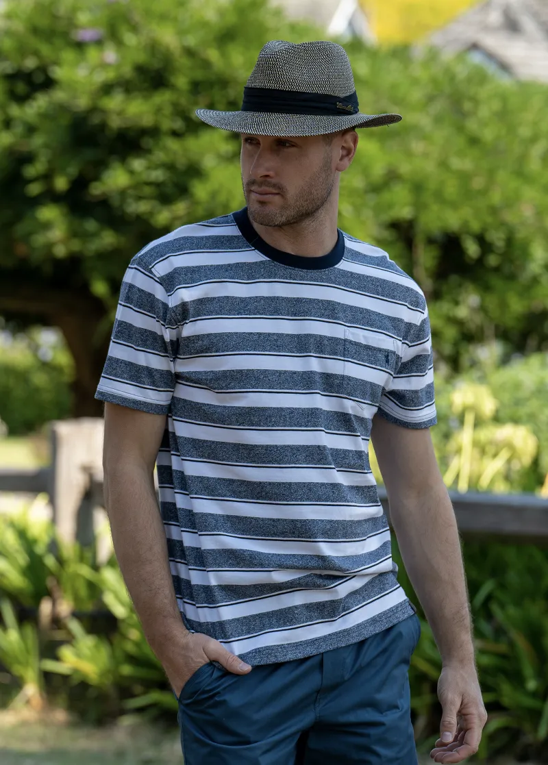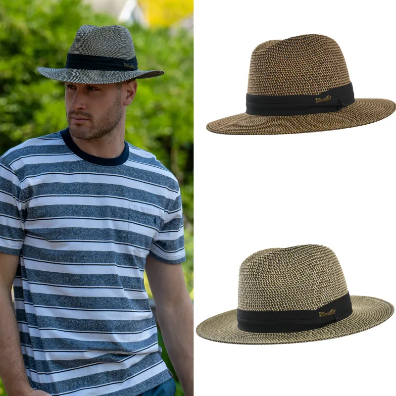 Brim Length: 7cm, Crown Height: 12cm, pleated black hat band, grosgrain sweatband, two tone colour detail, Thomas Cook metal logo pin.