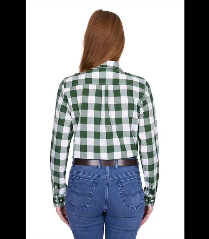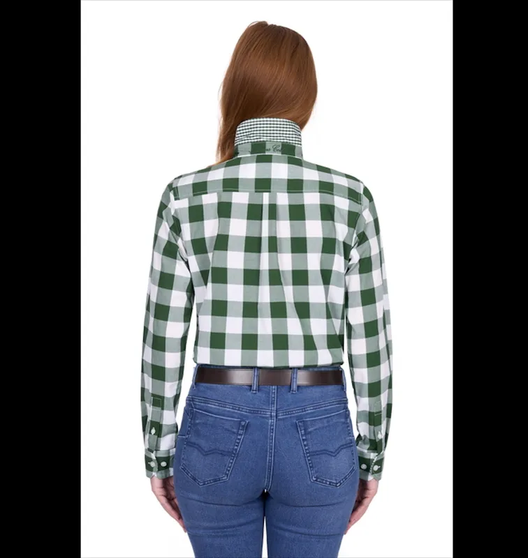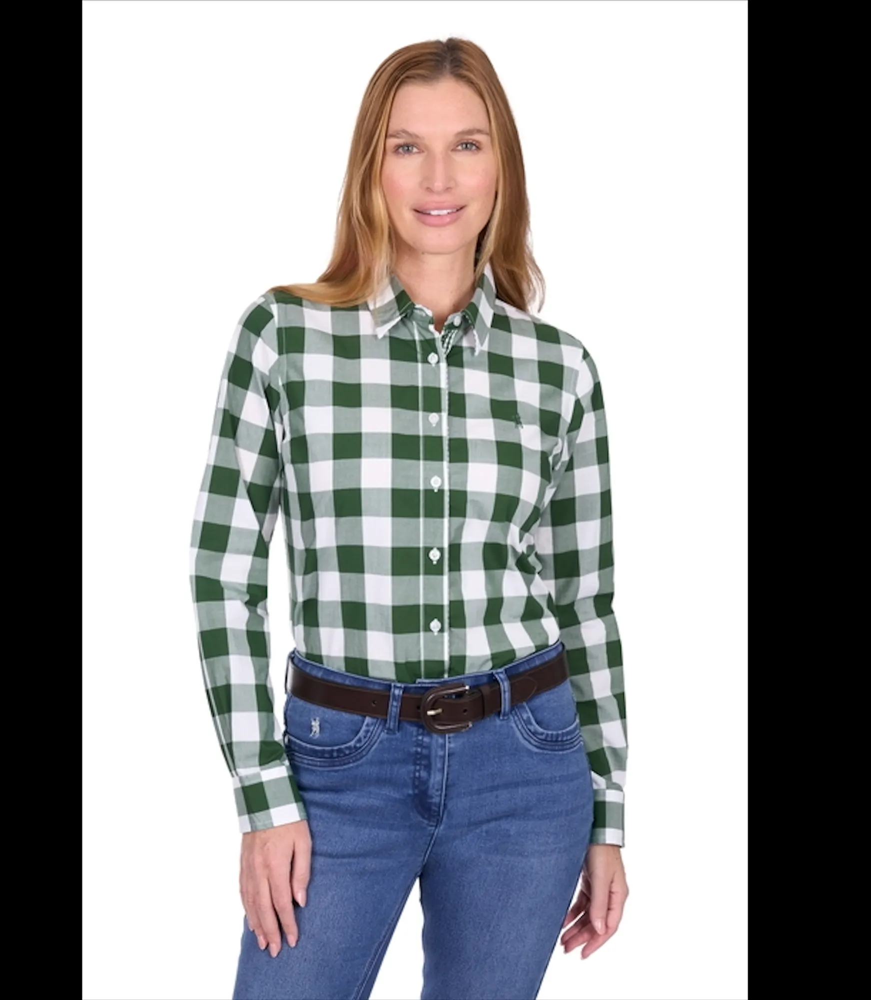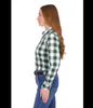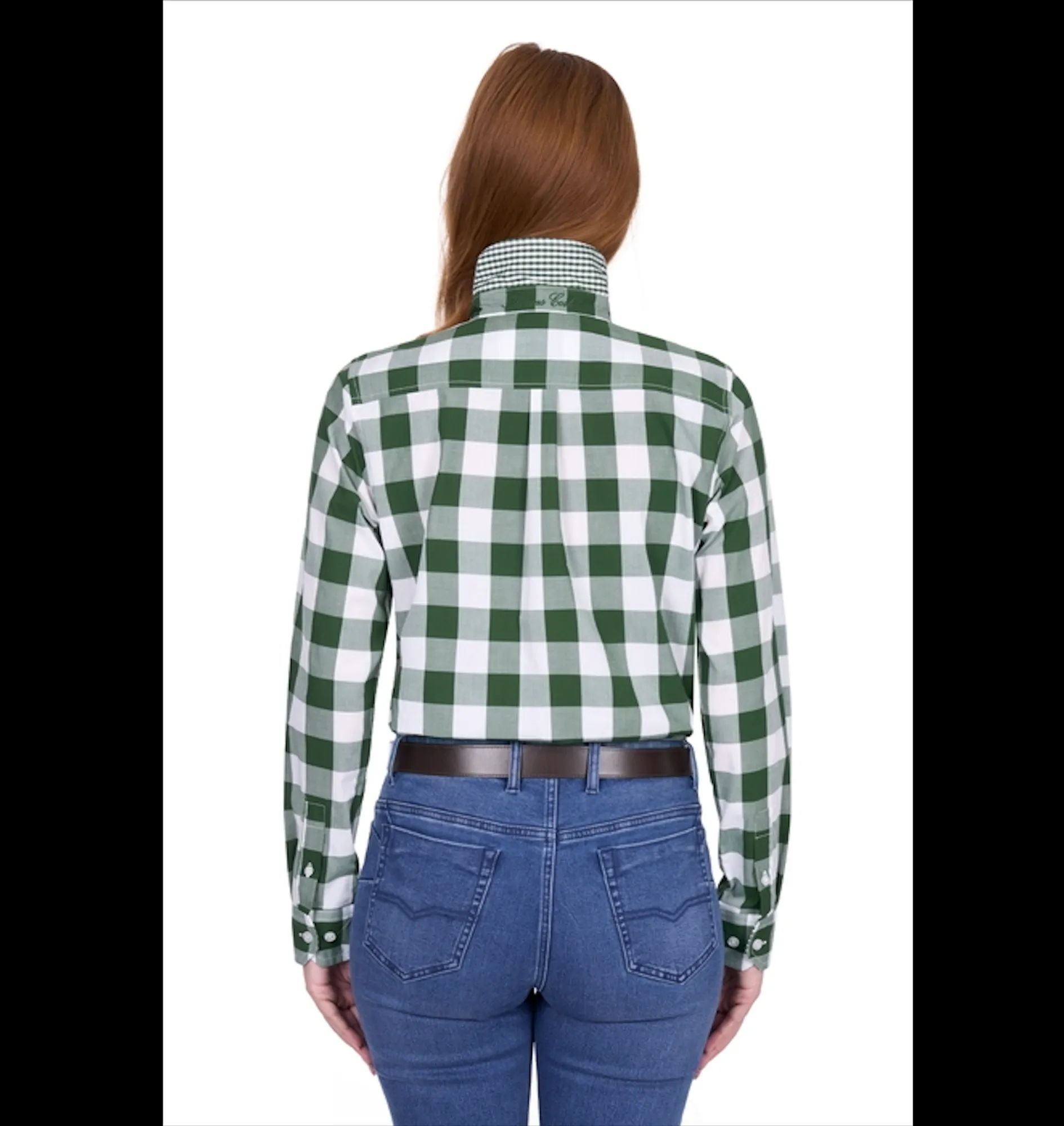 Cotton yarn dyed check, contrast gingham trims, grosgrain taping on inside neck, under placket and sleeve cuffs, pintuck detail at sleeve cuffs, criss cross embroidery on cuff pintucks, horseman embroidery on chest.