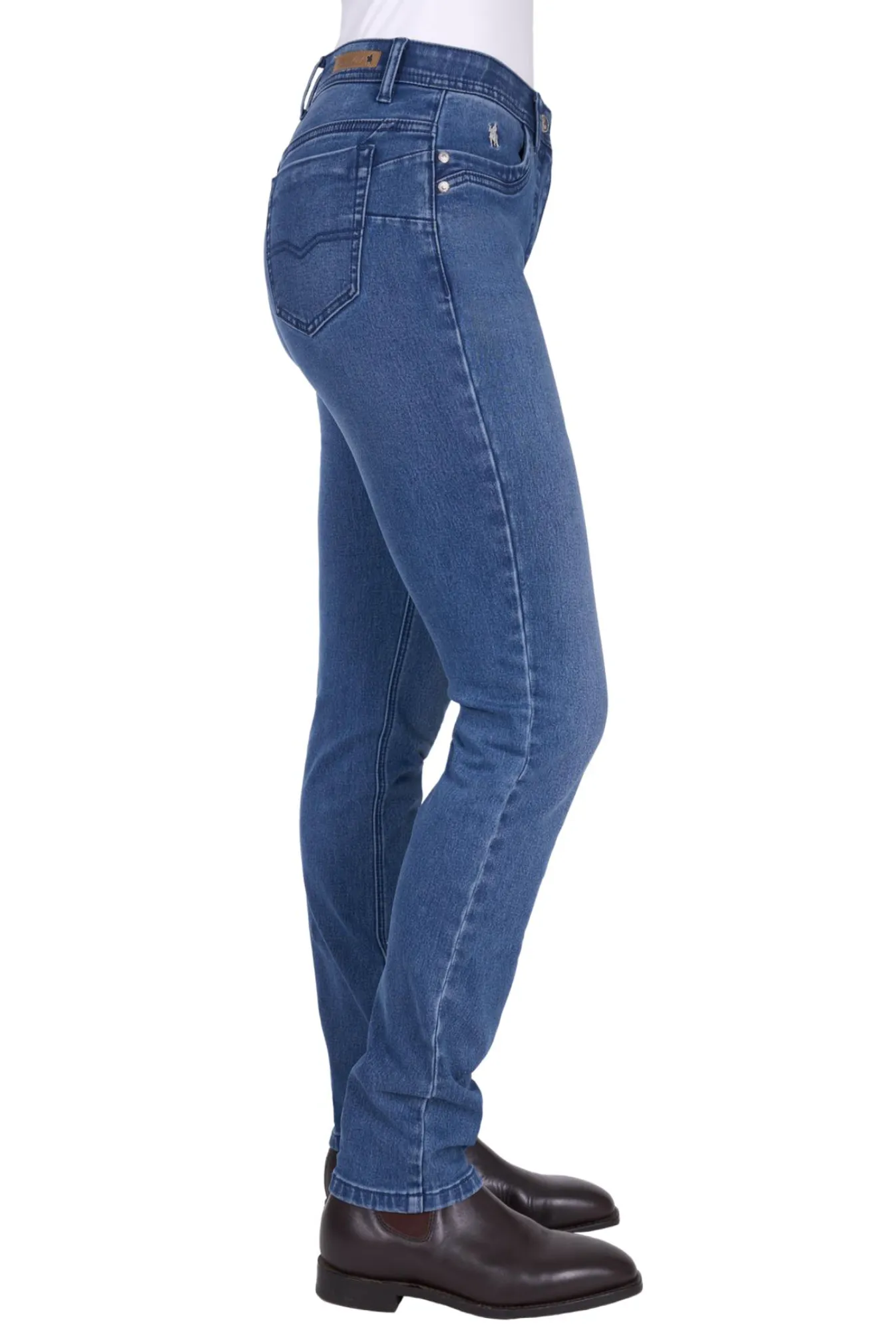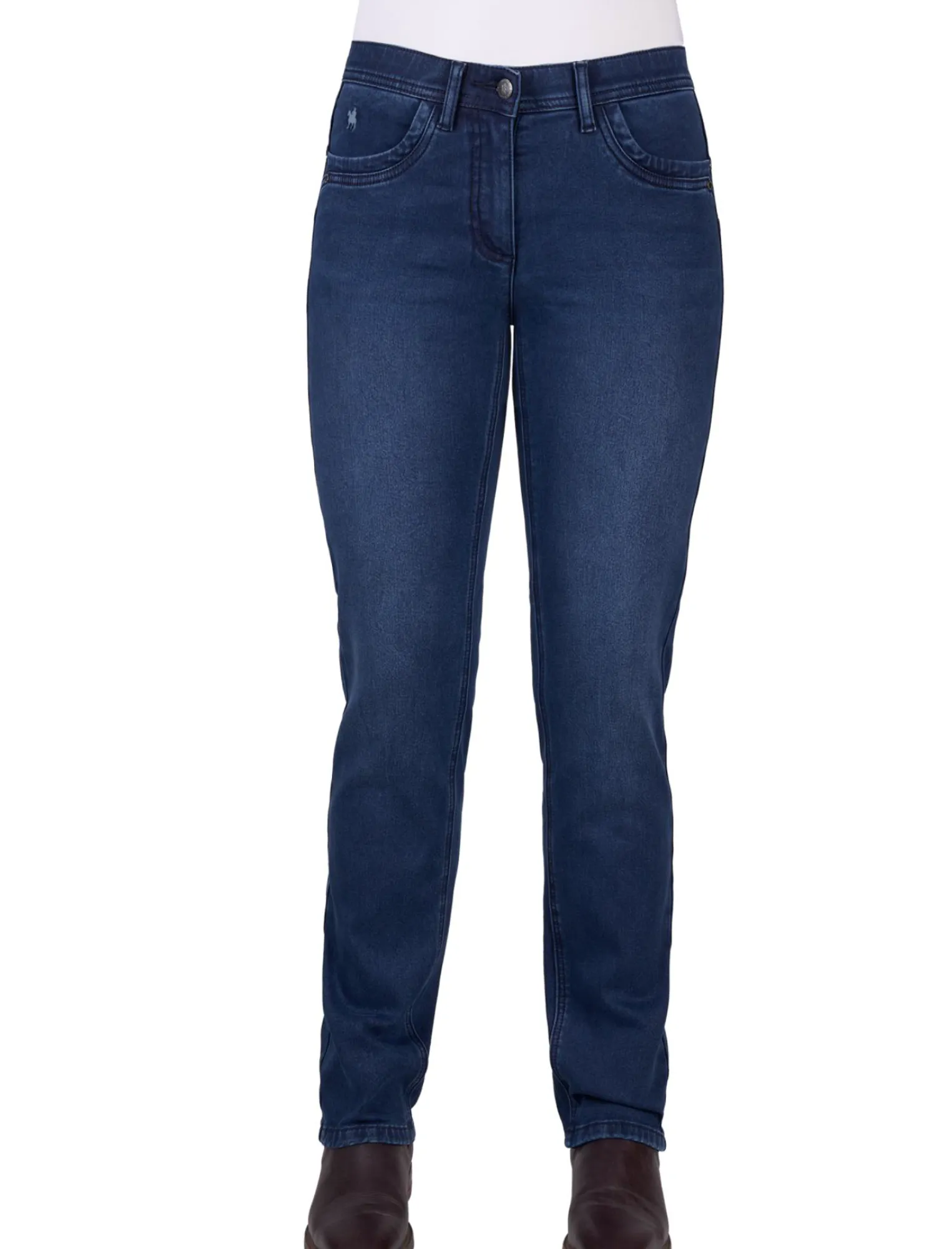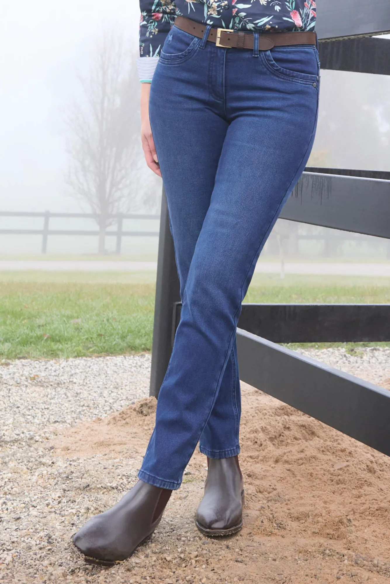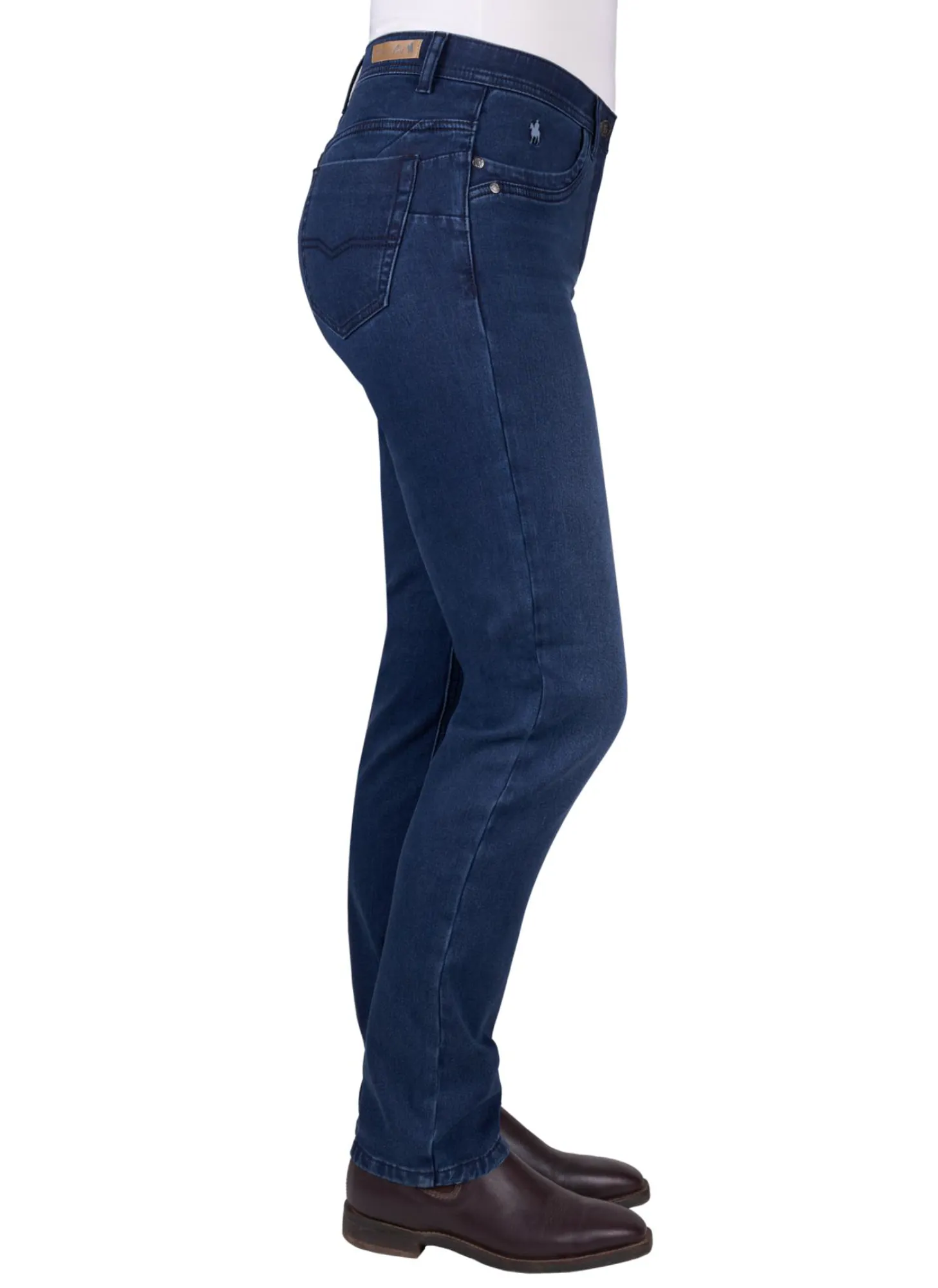Slim straight leg, underside of fabric with brushing for warm thermal qualities, breathable, stretch for comfort and movement, no gap elastic waistband, double stitched for strength, Thomas Cook mock leather badge, horseman embroidery on front pocket