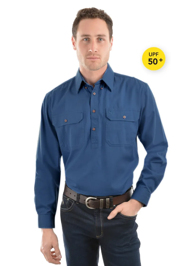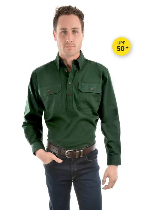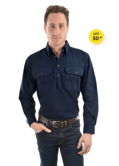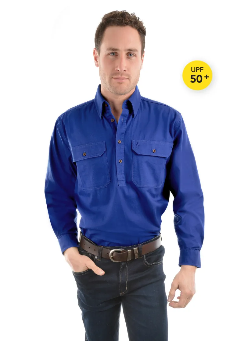 Features: UPF 50+ protection tested and approved, durable heavy weight fabric, classic work style, half placket for safety, 2 countryman pockets, concealed button down collar, logo buttons.