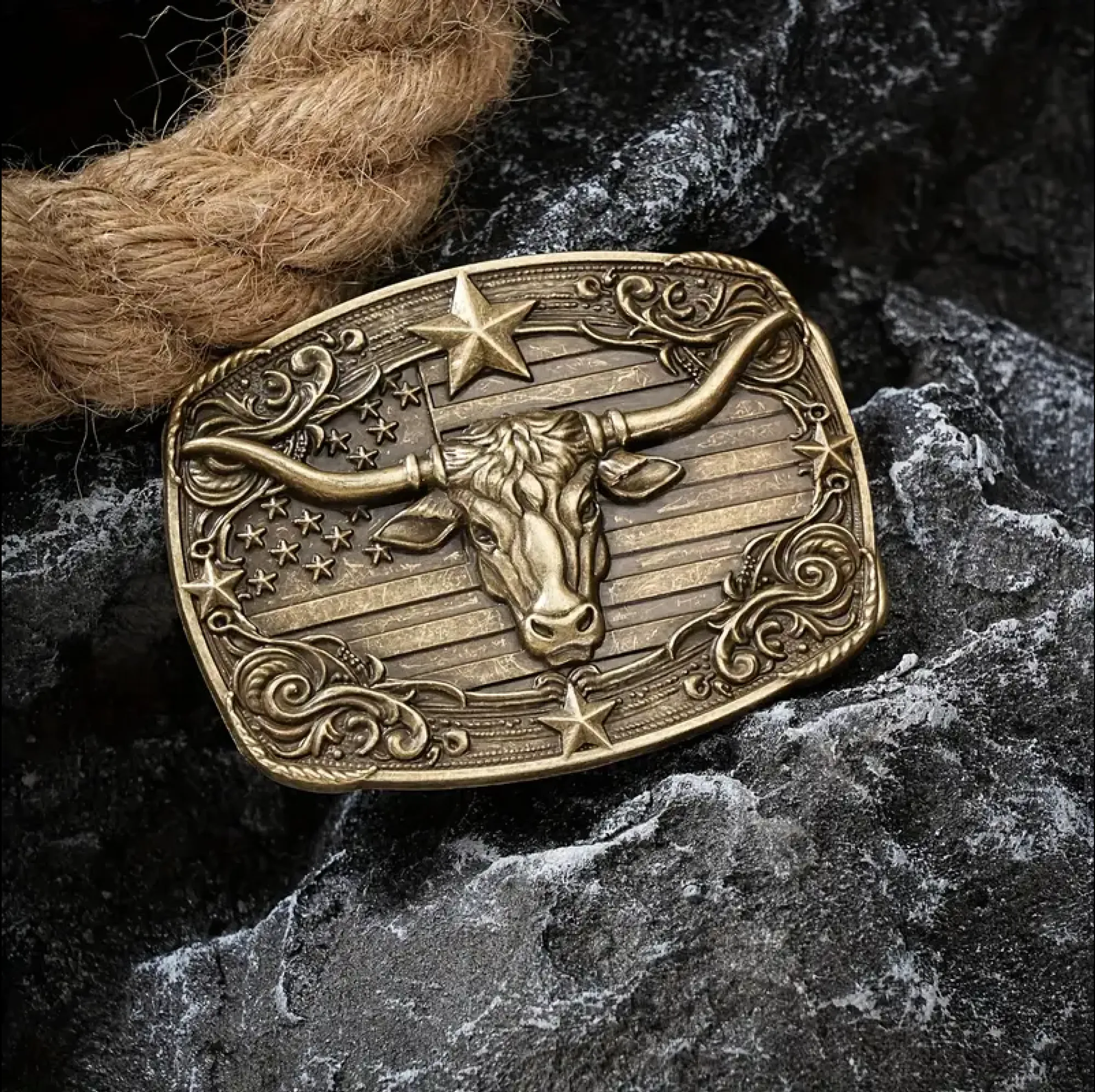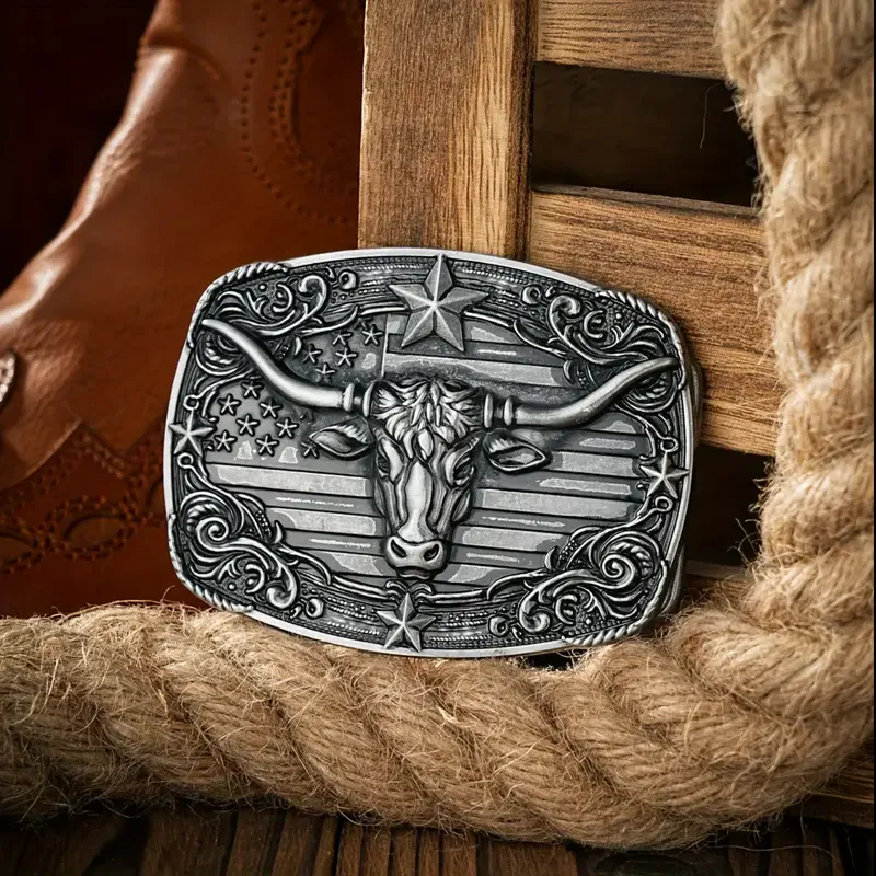 Western Cowboy Style Engraved Bull Head Alloy Buckle with Star Design.