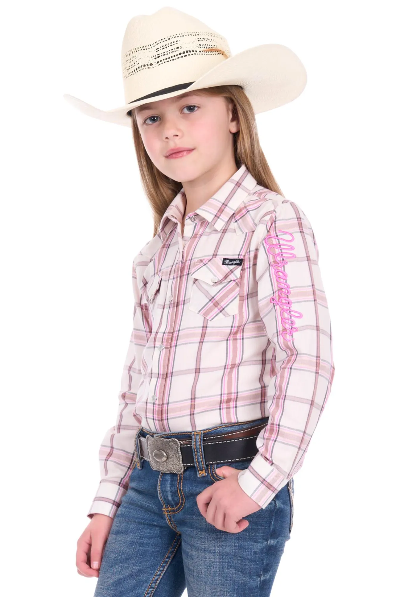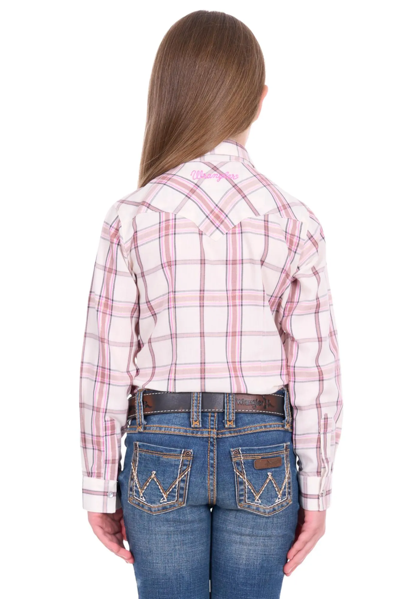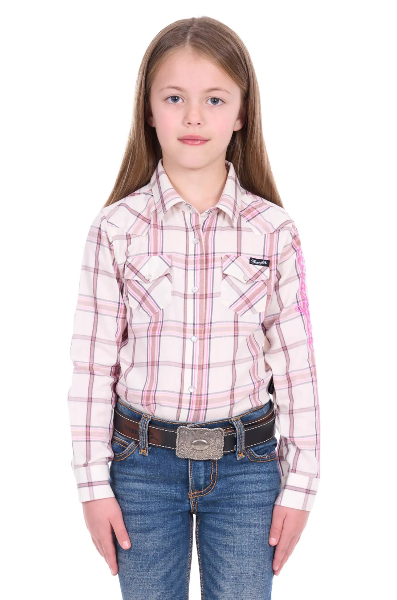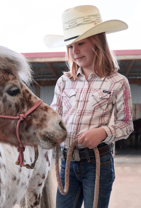 Classic western long sleeve shirt, pearl snap closure, western chest pockets, western front and back yokes, Wrangler® logo pip on side seam, back neck logo embroidery, sleeve logo print