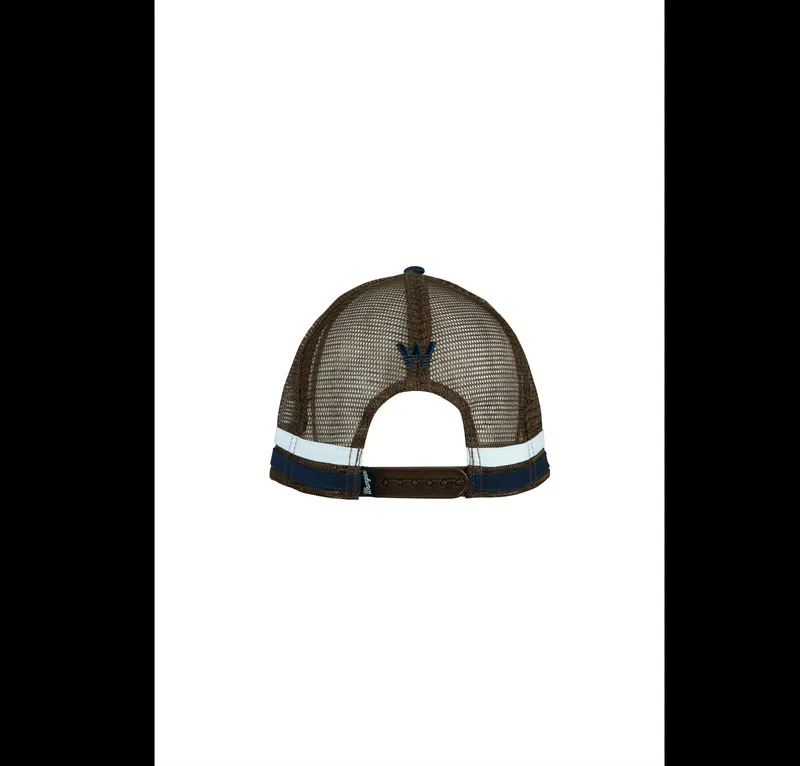 High profile 5 panel trucker cap, contrast sandwich peak, side panel taping, contrast crown piping.