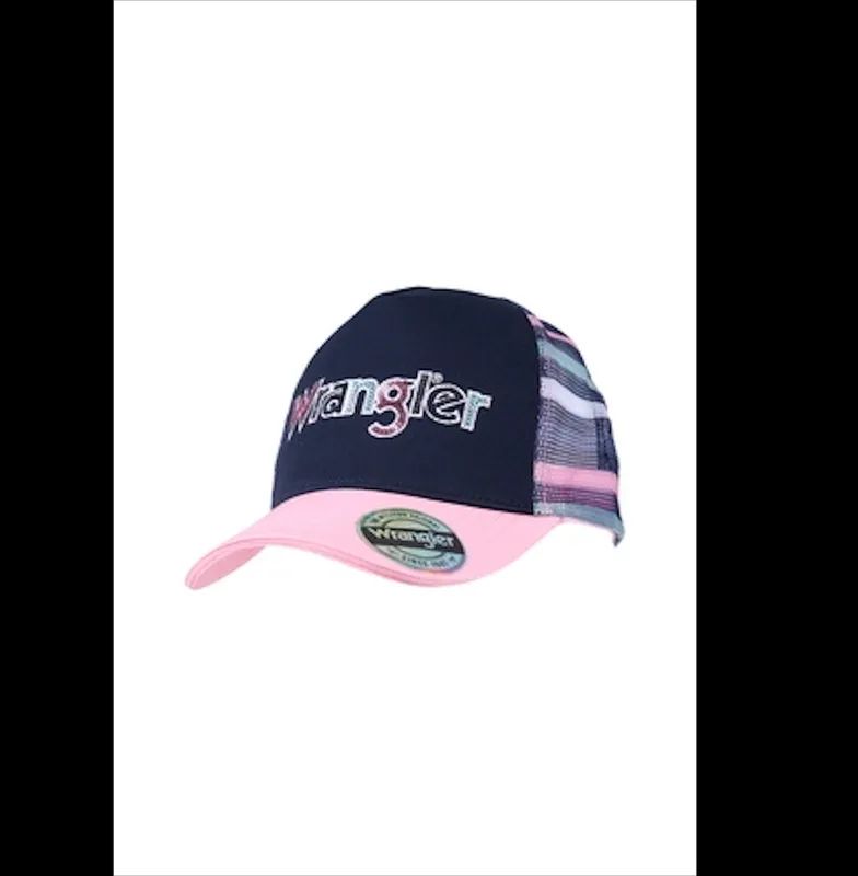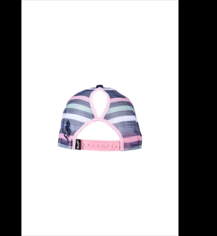 High profile 5 panel trucker cap, ponytail hole, recommended for 4 years and over, yardage printed mesh panels, contrast peak, contrast sandwich peak.