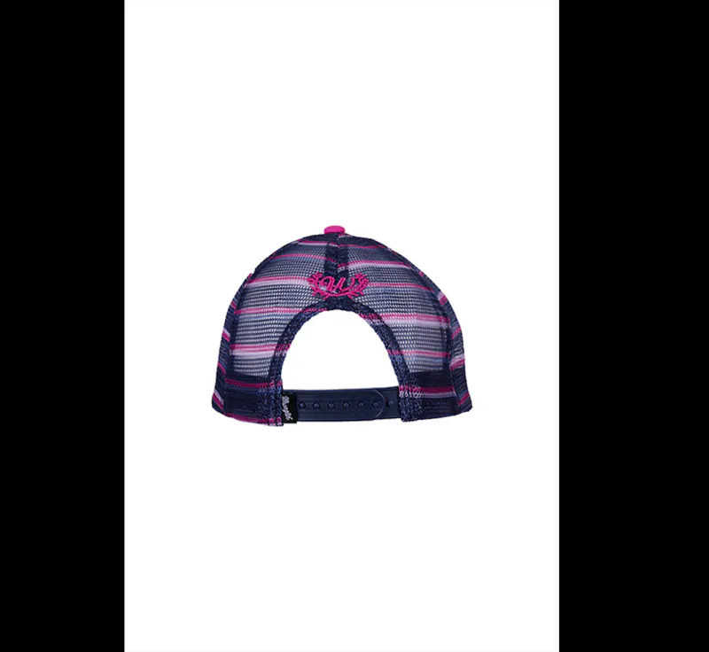 5 panel trucker cap, front multi-colour Wrangler® embroidery, yardage printed mesh panels, contrast peak with contrast stitching, contrast sandwich peak, Wrangler® back embroidery.
