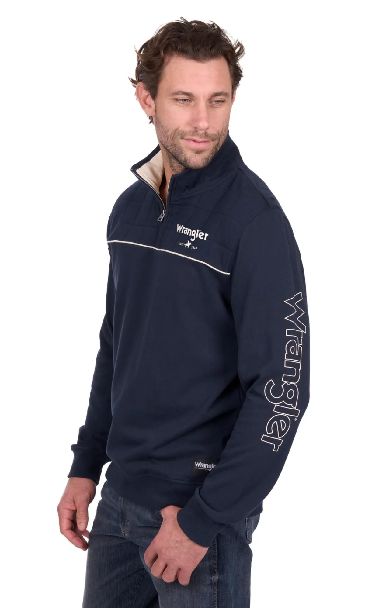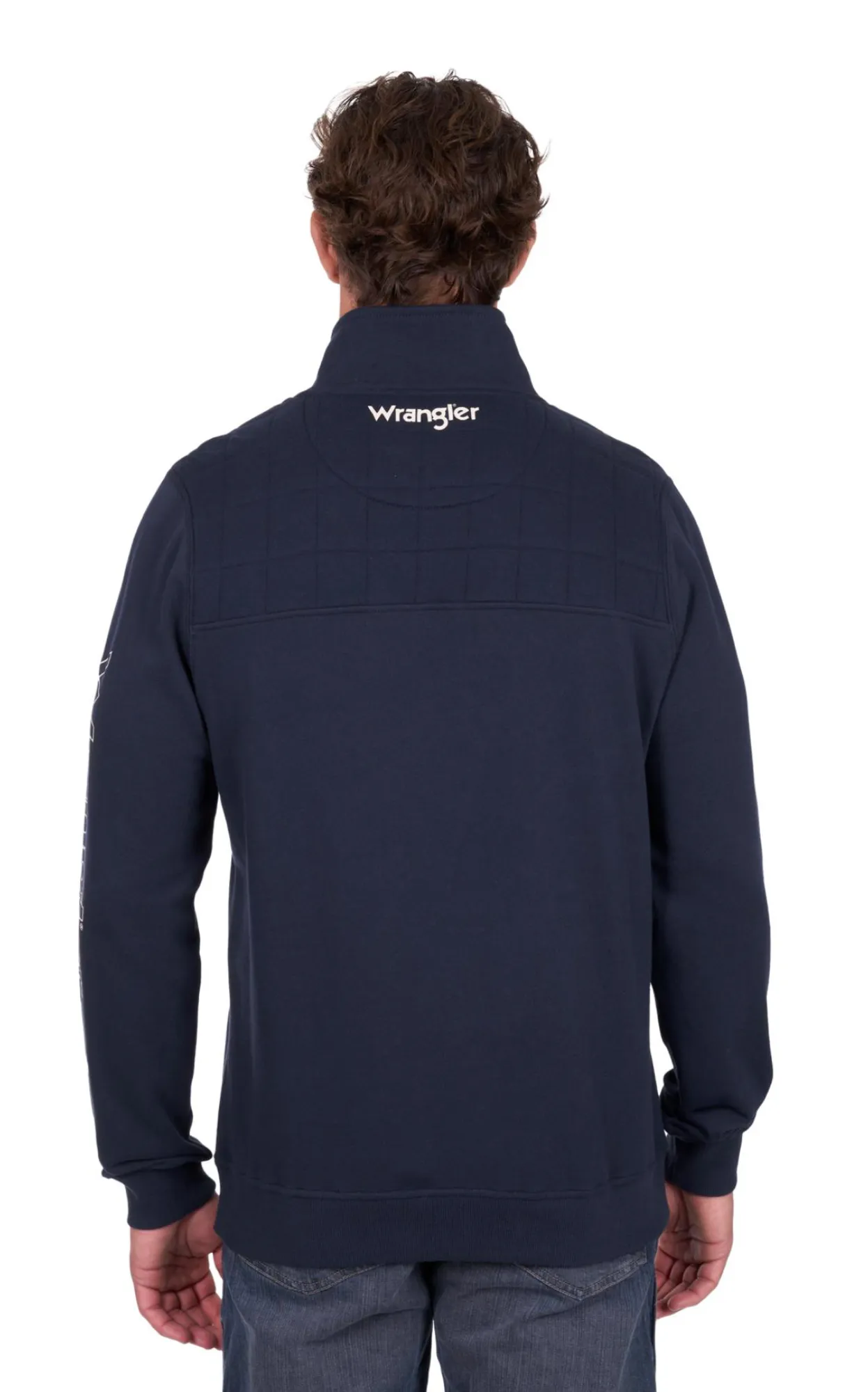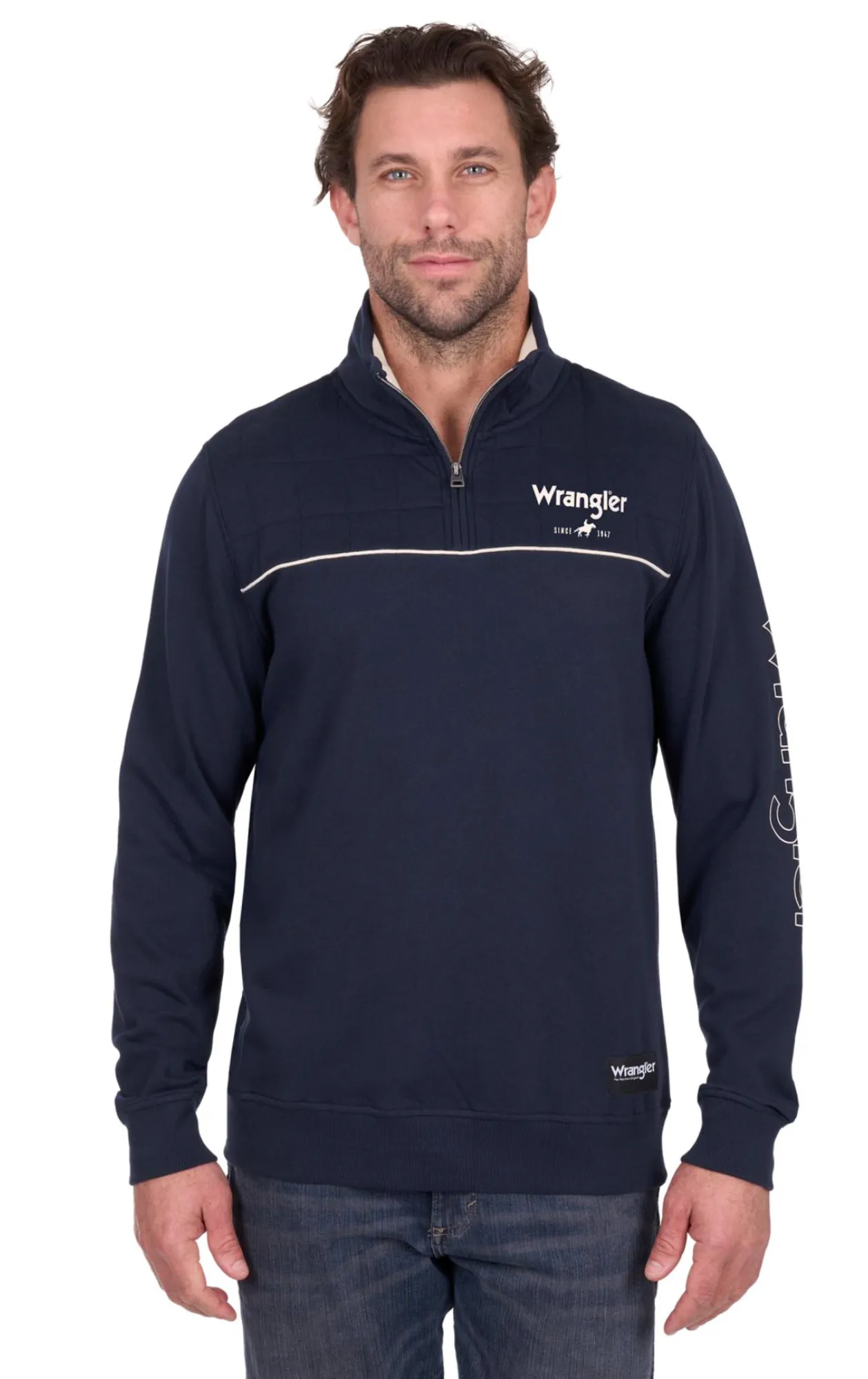 Medium weight french terry 1/4 zip pullover, quilted front and back yokes with piping detail, contrast rib trim on inner collar facing, rib trim hem and cuffs, Wrangler® iconic logo hem label, back neck logo print, chest logo print, sleeve logo print