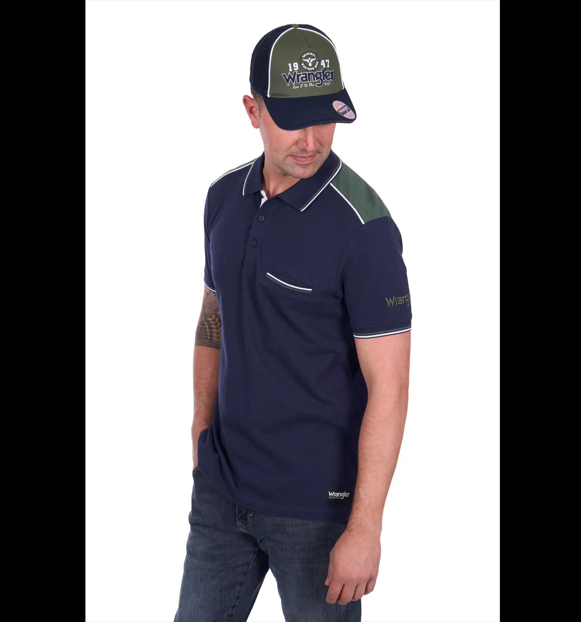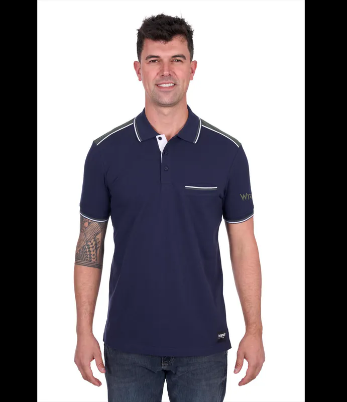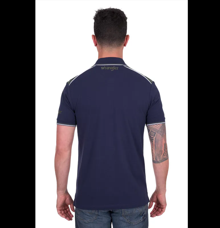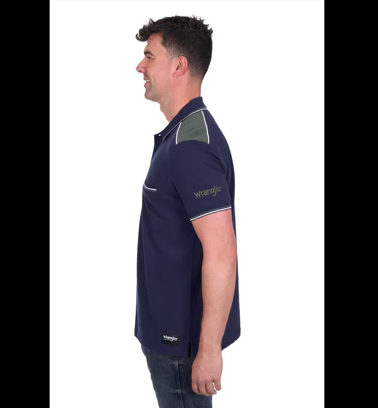 Classic polo shape, contrast shoulder panels with piping, rib trim (collar, sleeve cuffs and chest pocket) withcontrast stripe tipping, premiumquality herringbone taping on frontplacket, contrast herringbone taping on inner neck and side seam splits,Wrangler iconic logo hem label.