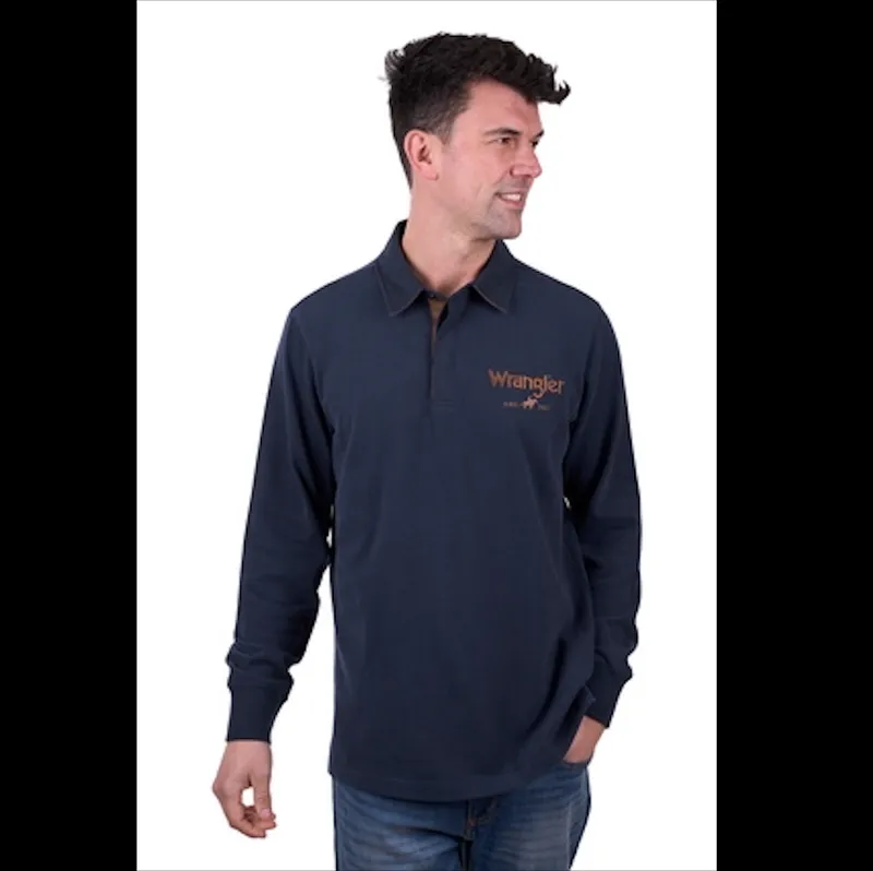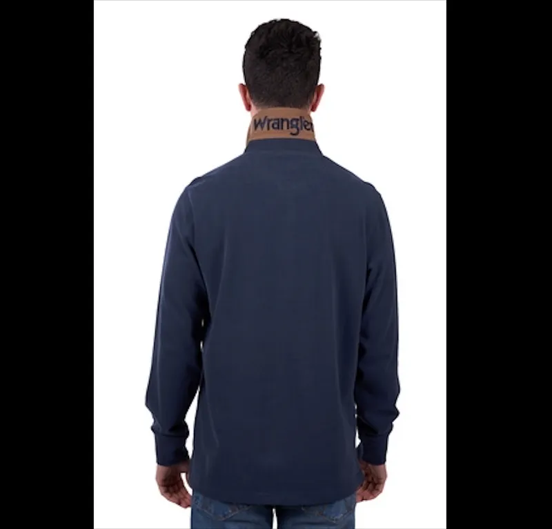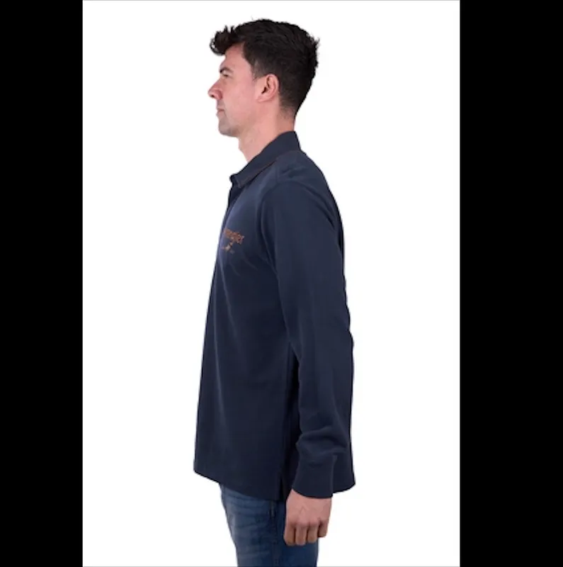 Heavyweight jersey knit rugby, concealed buttons on centre front placket, cotton drill collar with contrast underside, contrast herringbone tape trims on inside side seam splits, rib trim cuffs.