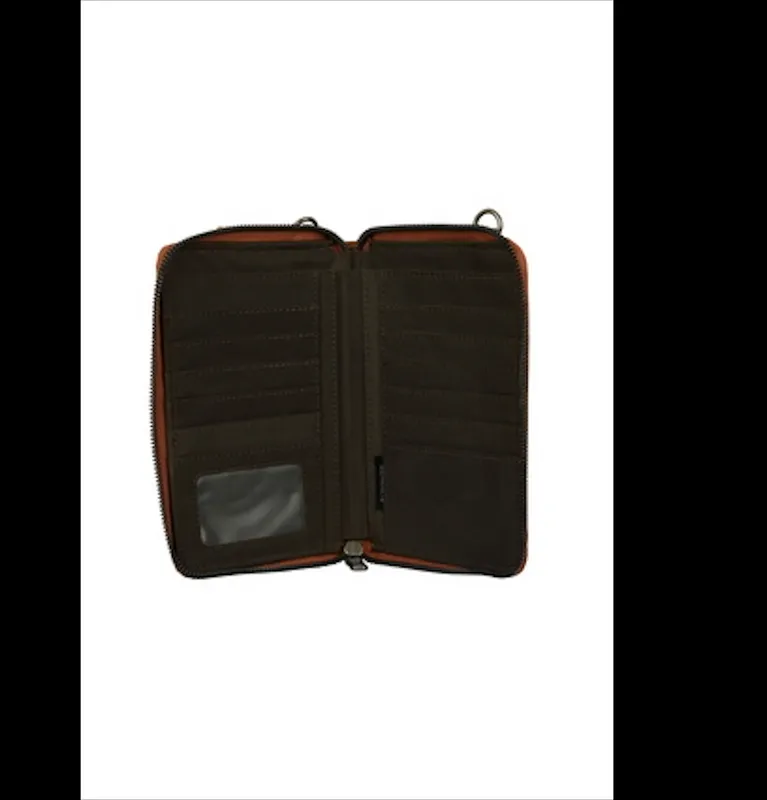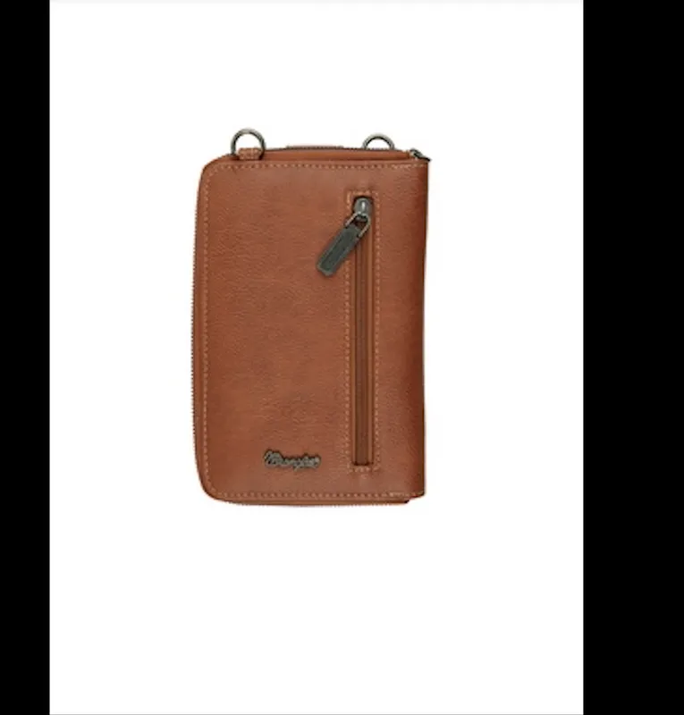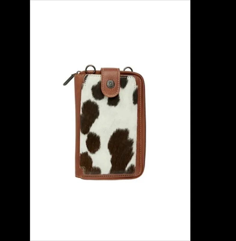 Genuine hair-on cowhide front panel, zip around closure, detachable and adjustable strap, 11 x card slots and 1 x ID slot, 4 x note pockets, 1 x back zip pocket, Wrangler® metal logo badge, RFID PROTECT technology protects your credit cards from fraud and identity theft.