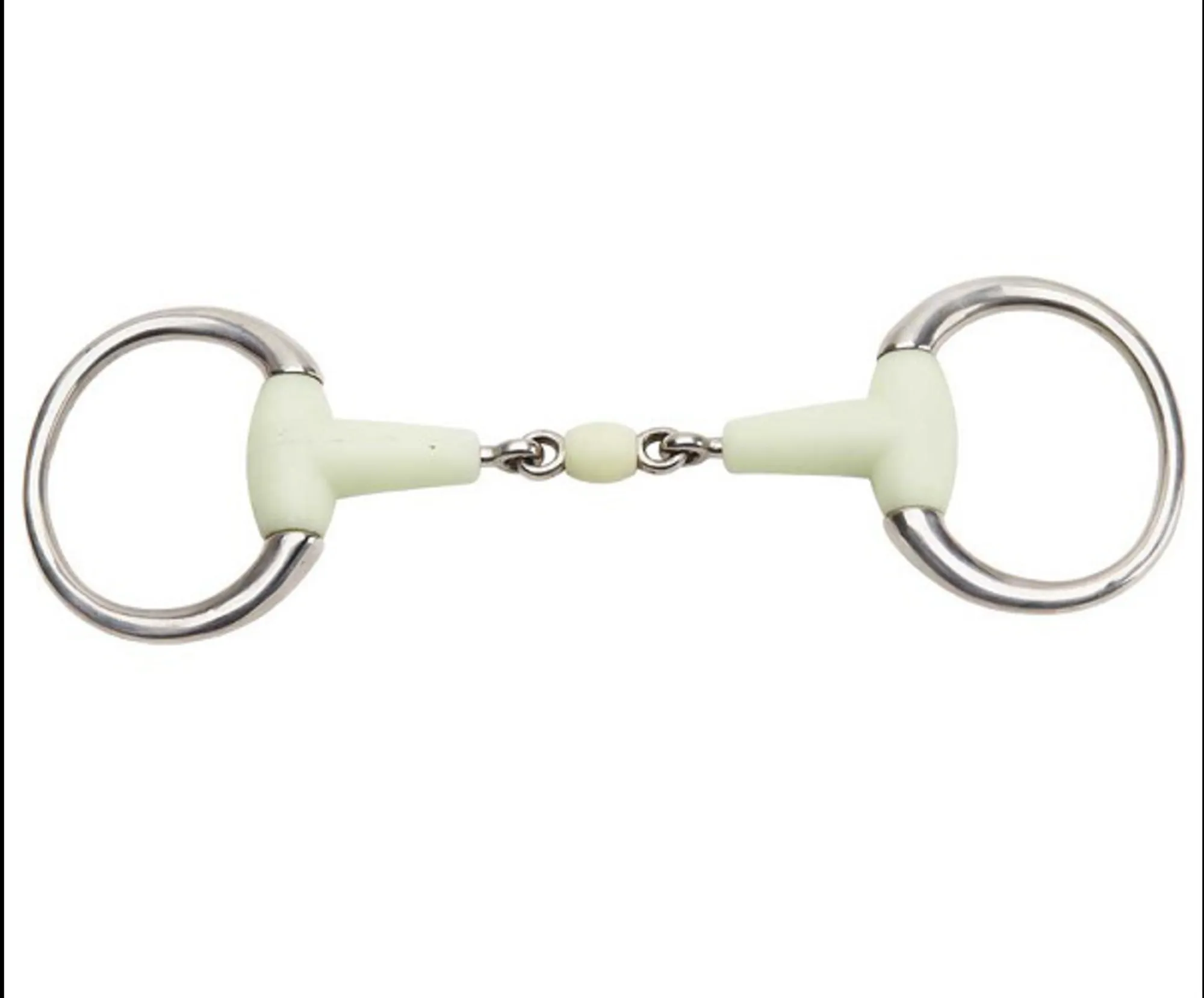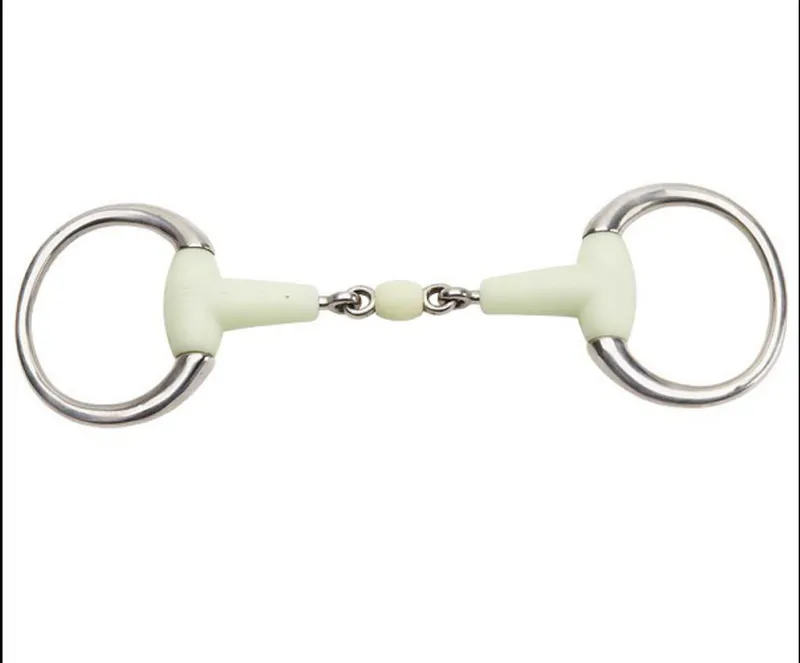 White mouth eggbutt training bit with "lozenge" shaped joint that sits flat on the tongue with rein pressure. Similar to "KK Training Bit". The polyurethane covering encourages relaxation, particularly in younger horses and forms a thicker mouthpiece that has a milder action.